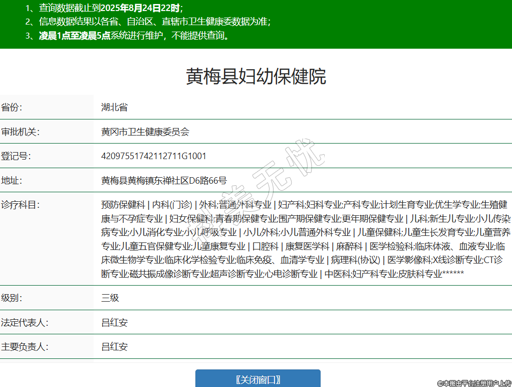 省份:湖北省審批機(jī)關(guān):黃岡市衛(wèi)生健康委員會(huì)登記號(hào):42097551742112711G1001地址:黃梅縣黃梅鎮(zhèn)東禪社區(qū)D6路66號(hào)診療科目:預(yù)防保健科 | 內(nèi)科(門診) | 外科;普通外科專業(yè) | 婦產(chǎn)科;婦科專業(yè);產(chǎn)科專業(yè);計(jì)劃生育專業(yè);優(yōu)生學(xué)專業(yè);生殖健康與不孕癥專業(yè) | 婦女保健科;青春期保健專業(yè);圍產(chǎn)期保健專業(yè);更年期保健專業(yè) | 兒科;新生兒專業(yè);小兒傳染病專業(yè);小兒消化專業(yè);小兒呼吸專業(yè) | 小兒外科;小兒普通外科專業(yè) | 兒童保健科;兒童生長發(fā)育專業(yè);兒童營養(yǎng)專業(yè);兒童五官保健專業(yè);兒童康復(fù)專業(yè) | 口腔科 | 康復(fù)醫(yī)學(xué)科 | 麻醉科 | 醫(yī)學(xué)檢驗(yàn)科;臨床體液、血液專業(yè);臨床微生物學(xué)專業(yè);臨床化學(xué)檢驗(yàn)專業(yè);臨床免疫、血清學(xué)專業(yè) | 病理科(協(xié)議) | 醫(yī)學(xué)影像科;X線診斷專業(yè);CT診斷專業(yè);磁共振成像診斷專業(yè);超聲診斷專業(yè);心電診斷專業(yè) | 中醫(yī)科;婦產(chǎn)科專業(yè);皮膚科專業(yè)******級(jí)別:三級(jí)法定代表人:呂紅安主要負(fù)責(zé)人:呂紅安執(zhí)業(yè)許可證有效期:2024/05/13 -至- 2034/05/21 -
