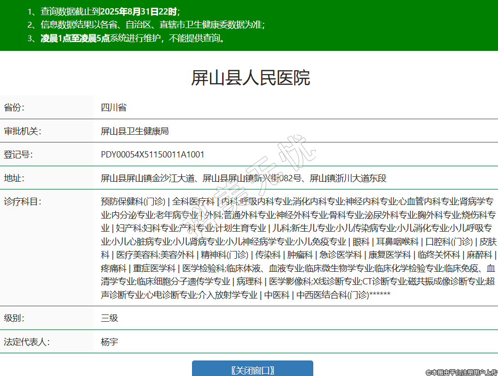 省份:四川省審批機(jī)關(guān):屏山縣衛(wèi)生健康局登記號(hào):PDY00054X51150011A1001地址:屏山縣屏山鎮(zhèn)金沙江大道、屏山縣屏山鎮(zhèn)新興街082號(hào)、屏山鎮(zhèn)浙川大道東段診療科目:預(yù)防保健科(門診) | 全科醫(yī)療科 | 內(nèi)科;呼吸內(nèi)科專業(yè);消化內(nèi)科專業(yè);神經(jīng)內(nèi)科專業(yè);心血管內(nèi)科專業(yè);腎病學(xué)專業(yè);內(nèi)分泌專業(yè);老年病專業(yè) | 外科;普通外科專業(yè);神經(jīng)外科專業(yè);骨科專業(yè);泌尿外科專業(yè);胸外科專業(yè);燒傷科專業(yè) | 婦產(chǎn)科;婦科專業(yè);產(chǎn)科專業(yè);計(jì)劃生育專業(yè) | 兒科;新生兒專業(yè);小兒傳染病專業(yè);小兒消化專業(yè);小兒呼吸專業(yè);小兒心臟病專業(yè);小兒腎病專業(yè);小兒神經(jīng)病學(xué)專業(yè);小兒免疫專業(yè) | 眼科 | 耳鼻咽喉科 | 口腔科(門診) | 皮膚科 | 醫(yī)療美容科;美容外科 | 精神科(門診) | 傳染科 | 腫瘤科 | 急診醫(yī)學(xué)科 | 康復(fù)醫(yī)學(xué)科 | 臨終關(guān)懷科 | 麻醉科 | 疼痛科 | 重癥醫(yī)學(xué)科 | 醫(yī)學(xué)檢驗(yàn)科;臨床體液、血液專業(yè);臨床微生物學(xué)專業(yè);臨床化學(xué)檢驗(yàn)專業(yè);臨床免疫、血清學(xué)專業(yè);臨床細(xì)胞分子遺傳學(xué)專業(yè) | 病理科 | 醫(yī)學(xué)影像科;X線診斷專業(yè);CT診斷專業(yè);磁共振成像診斷專業(yè);超聲診斷專業(yè);心電診斷專業(yè);介入放射學(xué)專業(yè) | 中醫(yī)科 | 中西醫(yī)結(jié)合科(門診)******級(jí)別:三級(jí)法定代表人:楊宇主要負(fù)責(zé)人:楊宇執(zhí)業(yè)許可證有效期:2014/12/31 -至- 2029/12/30 -