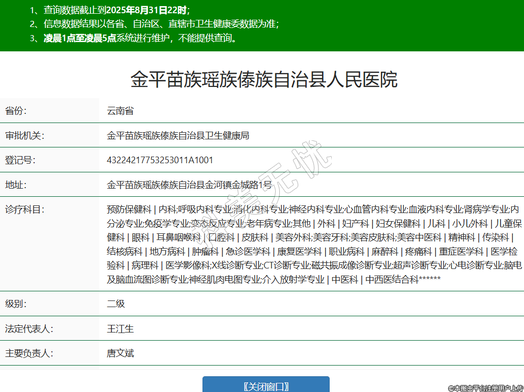 省份:云南省審批機關(guān):金平苗族瑤族傣族自治縣衛(wèi)生健康局登記號:43224217753253011A1001地址:金平苗族瑤族傣族自治縣金河鎮(zhèn)金城路1號診療科目:預防保健科 | 內(nèi)科;呼吸內(nèi)科專業(yè);消化內(nèi)科專業(yè);神經(jīng)內(nèi)科專業(yè);心血管內(nèi)科專業(yè);血液內(nèi)科專業(yè);腎病學專業(yè);內(nèi)分泌專業(yè);免疫學專業(yè);變態(tài)反應專業(yè);老年病專業(yè);其他 | 外科 | 婦產(chǎn)科 | 婦女保健科 | 兒科 | 小兒外科 | 兒童保健科 | 眼科 | 耳鼻咽喉科 | 口腔科 | 皮膚科 | 美容外科;美容牙科;美容皮膚科;美容中醫(yī)科 | 精神科 | 傳染科 | 結(jié)核病科 | 地方病科 | 腫瘤科 | 急診醫(yī)學科 | 康復醫(yī)學科 | 職業(yè)病科 | 麻醉科 | 疼痛科 | 重癥醫(yī)學科 | 醫(yī)學檢驗科 | 病理科 | 醫(yī)學影像科;X線診斷專業(yè);CT診斷專業(yè);磁共振成像診斷專業(yè);超聲診斷專業(yè);心電診斷專業(yè);腦電及腦血流圖診斷專業(yè);神經(jīng)肌肉電圖專業(yè);介入放射學專業(yè) | 中醫(yī)科 | 中西醫(yī)結(jié)合科******級別:二級法定代表人:王江生主要負責人:唐文斌執(zhí)業(yè)許可證有效期:2025/04/01 -至- 2038/09/14 -