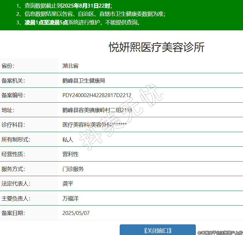 省份:湖北省備案機(jī)關(guān):鶴峰縣衛(wèi)生健康局備案編號:PDY240002H42282817D2212地址:鶴峰縣容美鎮(zhèn)康嶺村二組21號診療科目:醫(yī)療美容科(美容外科)******所有制形式:私人經(jīng)營性質(zhì):營利性服務(wù)方式:門診服務(wù)法定代表人:龔平主要負(fù)責(zé)人:萬福洋備案日期:2025/05/07 -