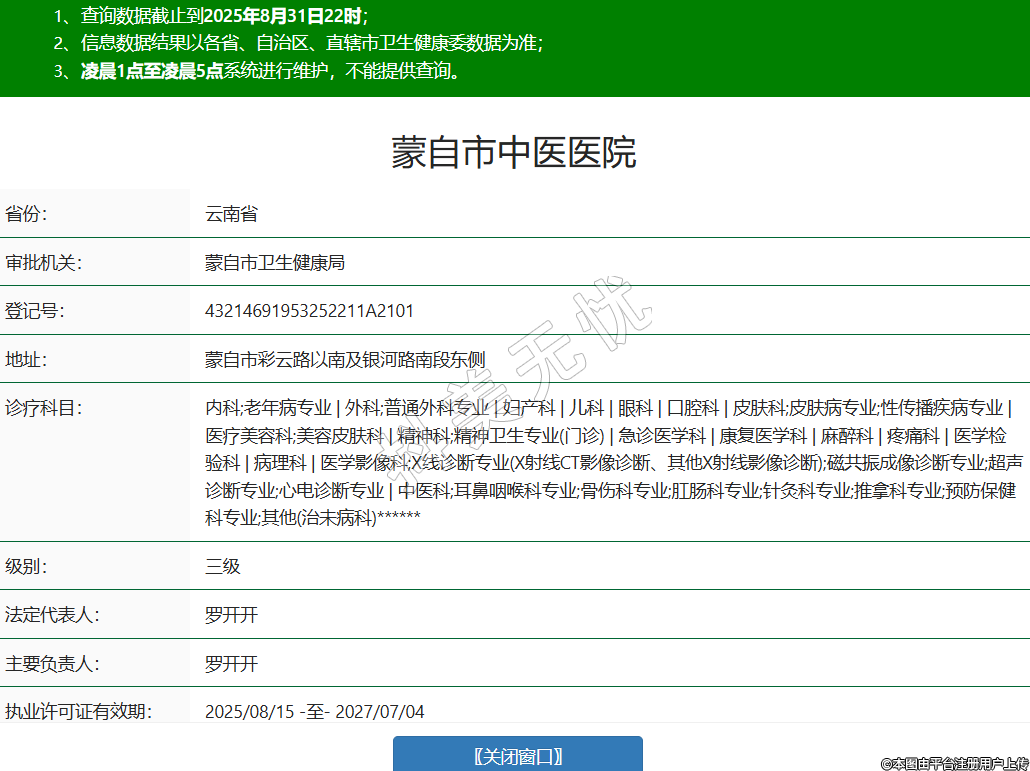 省份:云南省審批機(jī)關(guān):蒙自市衛(wèi)生健康局登記號(hào):43214691953252211A2101地址:蒙自市彩云路以南及銀河路南段東側(cè)診療科目:內(nèi)科;老年病專(zhuān)業(yè) | 外科;普通外科專(zhuān)業(yè) | 婦產(chǎn)科 | 兒科 | 眼科 | 口腔科 | 皮膚科;皮膚病專(zhuān)業(yè);性傳播疾病專(zhuān)業(yè) | 醫(yī)療美容科;美容皮膚科 | 精神科;精神衛(wèi)生專(zhuān)業(yè)(門(mén)診) | 急診醫(yī)學(xué)科 | 康復(fù)醫(yī)學(xué)科 | 麻醉科 | 疼痛科 | 醫(yī)學(xué)檢驗(yàn)科 | 病理科 | 醫(yī)學(xué)影像科;X線(xiàn)診斷專(zhuān)業(yè)(X射線(xiàn)CT影像診斷、其他X射線(xiàn)影像診斷);磁共振成像診斷專(zhuān)業(yè);超聲診斷專(zhuān)業(yè);心電診斷專(zhuān)業(yè) | 中醫(yī)科;耳鼻咽喉科專(zhuān)業(yè);骨傷科專(zhuān)業(yè);肛腸科專(zhuān)業(yè);針灸科專(zhuān)業(yè);推拿科專(zhuān)業(yè);預(yù)防保健科專(zhuān)業(yè);其他(治未病科)******級(jí)別:三級(jí)法定代表人:羅開(kāi)開(kāi)主要負(fù)責(zé)人:羅開(kāi)開(kāi)執(zhí)業(yè)許可證有效期:2025/08/15 -至- 2027/07/04 -