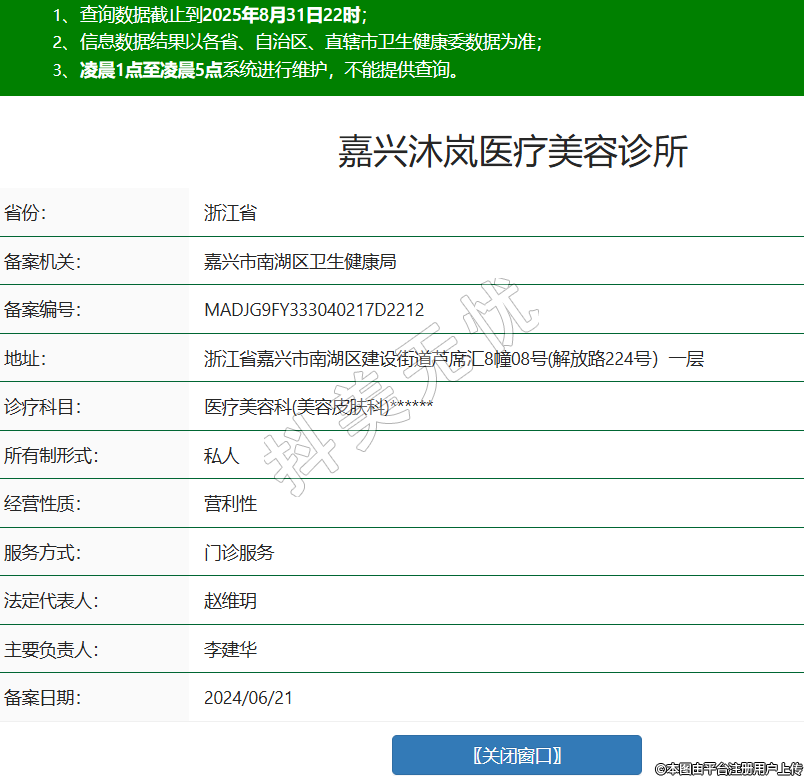 省份:浙江省備案機(jī)關(guān):嘉興市南湖區(qū)衛(wèi)生健康局備案編號:MADJG9FY333040217D2212地址:浙江省嘉興市南湖區(qū)建設(shè)街道蘆席匯8幢08號(解放路224號)一層診療科目:醫(yī)療美容科(美容皮膚科)******所有制形式:私人經(jīng)營性質(zhì):營利性服務(wù)方式:門診服務(wù)法定代表人:趙維玥主要負(fù)責(zé)人:李建華備案日期:2024/06/21 -