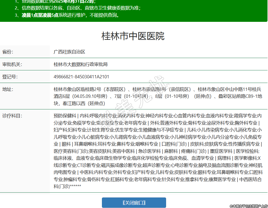 省份:廣西壯族自治區(qū)審批機關:桂林市大數據和行政審批局登記號:49866821-845030411A2101地址:桂林市象山區(qū)臨桂路2號(本部院區(qū))、桂林市崇信路8號(崇信院區(qū))、桂林市象山區(qū)中山中路11號桂兵酒店6層(04.05.09.10號房)、7層(01-10號房)、8層(01-10號房)(延伸點)、疊彩區(qū)站前路CB9-1地塊,春江路以西(延伸點)診療科目:預防保健科 | 內科;呼吸內科專業(yè);消化內科專業(yè);神經內科專業(yè);心血管內科專業(yè);血液內科專業(yè);腎病學專業(yè);內分泌專業(yè);免疫學專業(yè);變態(tài)反應專業(yè);老年病專業(yè) | 外科;普通外科專業(yè);骨科專業(yè);泌尿外科專業(yè);胸外科專業(yè) | 婦產科;婦科專業(yè);計劃生育專業(yè);優(yōu)生學專業(yè);生殖健康與不孕癥專業(yè) | 兒科;小兒傳染病專業(yè);小兒消化專業(yè);小兒呼吸專業(yè);小兒心臟病專業(yè);小兒腎病專業(yè);小兒血液病專業(yè);小兒神經病學專業(yè);小兒內分泌專業(yè);小兒免疫專業(yè) | 眼科 | 耳鼻咽喉科;耳科專業(yè);鼻科專業(yè);咽喉科專業(yè) | 口腔科(門診) | 皮膚科;皮膚病專業(yè);性傳播疾病專業(yè) | 醫(yī)療美容科(門診);美容皮膚科;美容中醫(yī)科 | 急診醫(yī)學科 | 麻醉科 | 疼痛科(門診) | 重癥醫(yī)學科 | 醫(yī)學檢驗科;臨床體液、血液專業(yè);臨床微生物學專業(yè);臨床化學檢驗專業(yè);臨床免疫、血清學專業(yè) | 病理科 | 醫(yī)學影像科;X線診斷專業(yè);CT診斷專業(yè);磁共振成像診斷專業(yè);超聲診斷專業(yè);心電診斷專業(yè);腦電及腦血流圖診斷專業(yè);神經肌肉電圖專業(yè) | 中醫(yī)科;內科專業(yè);外科專業(yè);婦產科專業(yè);兒科專業(yè);皮膚科專業(yè);眼科專業(yè);耳鼻咽喉科專業(yè);口腔科專業(yè);腫瘤科專業(yè);骨傷科專業(yè);肛腸科專業(yè);老年病科專業(yè);針灸科專業(yè);推拿科專業(yè);康復醫(yī)學專業(yè) | 中西醫(yī)結合科(門診)******級別:三級法定代表人:譚永星主要負責人:譚永星執(zhí)業(yè)許可證有效期:2021/10/28 -至- 2036/10/27 -