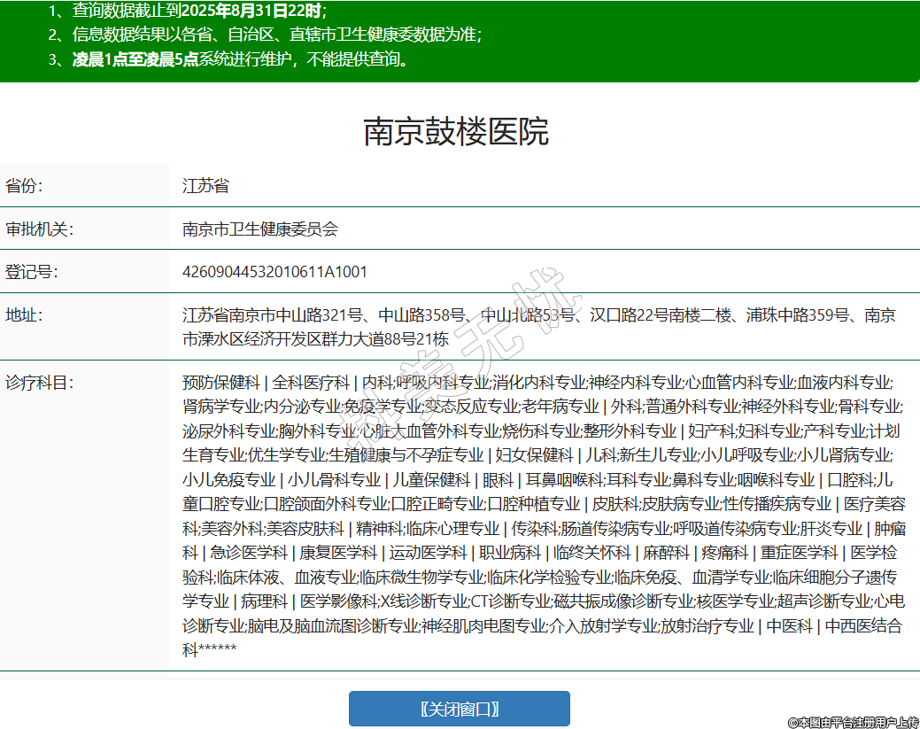 省份:江蘇省審批機關(guān):南京市衛(wèi)生健康委員會登記號:42609044532010611A1001地址:江蘇省南京市中山路321號、中山路358號、中山北路53號、漢口路22號南樓二樓、浦珠中路359號、南京市溧水區(qū)經(jīng)濟開發(fā)區(qū)群力大道88號21棟診療科目:預防保健科 | 全科醫(yī)療科 | 內(nèi)科;呼吸內(nèi)科專業(yè);消化內(nèi)科專業(yè);神經(jīng)內(nèi)科專業(yè);心血管內(nèi)科專業(yè);血液內(nèi)科專業(yè);腎病學專業(yè);內(nèi)分泌專業(yè);免疫學專業(yè);變態(tài)反應專業(yè);老年病專業(yè) | 外科;普通外科專業(yè);神經(jīng)外科專業(yè);骨科專業(yè);泌尿外科專業(yè);胸外科專業(yè);心臟大血管外科專業(yè);燒傷科專業(yè);整形外科專業(yè) | 婦產(chǎn)科;婦科專業(yè);產(chǎn)科專業(yè);計劃生育專業(yè);優(yōu)生學專業(yè);生殖健康與不孕癥專業(yè) | 婦女保健科 | 兒科;新生兒專業(yè);小兒呼吸專業(yè);小兒腎病專業(yè);小兒免疫專業(yè) | 小兒骨科專業(yè) | 兒童保健科 | 眼科 | 耳鼻咽喉科;耳科專業(yè);鼻科專業(yè);咽喉科專業(yè) | 口腔科;兒童口腔專業(yè);口腔頜面外科專業(yè);口腔正畸專業(yè);口腔種植專業(yè) | 皮膚科;皮膚病專業(yè);性傳播疾病專業(yè) | 醫(yī)療美容科;美容外科;美容皮膚科 | 精神科;臨床心理專業(yè) | 傳染科;腸道傳染病專業(yè);呼吸道傳染病專業(yè);肝炎專業(yè) | 腫瘤科 | 急診醫(yī)學科 | 康復醫(yī)學科 | 運動醫(yī)學科 | 職業(yè)病科 | 臨終關(guān)懷科 | 麻醉科 | 疼痛科 | 重癥醫(yī)學科 | 醫(yī)學檢驗科;臨床體液、血液專業(yè);臨床微生物學專業(yè);臨床化學檢驗專業(yè);臨床免疫、血清學專業(yè);臨床細胞分子遺傳學專業(yè) | 病理科 | 醫(yī)學影像科;X線診斷專業(yè);CT診斷專業(yè);磁共振成像診斷專業(yè);核醫(yī)學專業(yè);超聲診斷專業(yè);心電診斷專業(yè);腦電及腦血流圖診斷專業(yè);神經(jīng)肌肉電圖專業(yè);介入放射學專業(yè);放射治療專業(yè) | 中醫(yī)科 | 中西醫(yī)結(jié)合科******級別:三級法定代表人:于成功主要負責人:夏海鳴執(zhí)業(yè)許可證有效期:2024/11/25 -至- 2036/01/22 -