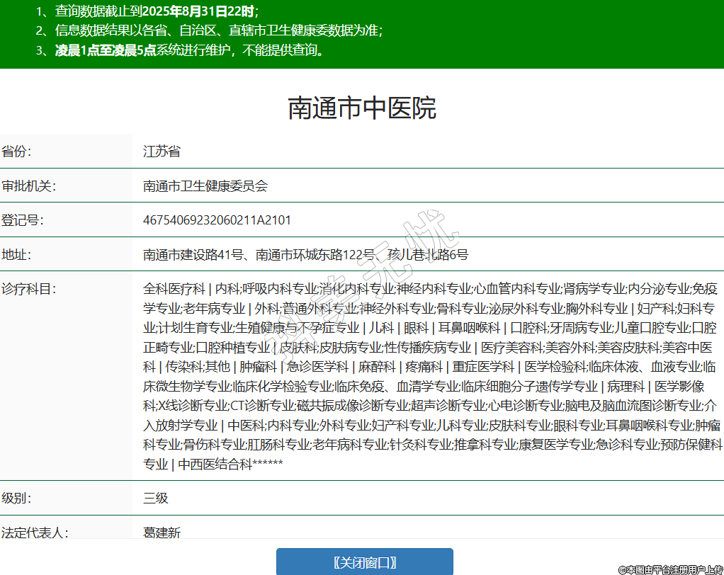 省份:江蘇省審批機(jī)關(guān):南通市衛(wèi)生健康委員會(huì)登記號(hào):46754069232060211A2101地址:南通市建設(shè)路41號(hào)、南通市環(huán)城東路122號(hào)、孩兒巷北路6號(hào)診療科目:全科醫(yī)療科 | 內(nèi)科;呼吸內(nèi)科專(zhuān)業(yè);消化內(nèi)科專(zhuān)業(yè);神經(jīng)內(nèi)科專(zhuān)業(yè);心血管內(nèi)科專(zhuān)業(yè);腎病學(xué)專(zhuān)業(yè);內(nèi)分泌專(zhuān)業(yè);免疫學(xué)專(zhuān)業(yè);老年病專(zhuān)業(yè) | 外科;普通外科專(zhuān)業(yè);神經(jīng)外科專(zhuān)業(yè);骨科專(zhuān)業(yè);泌尿外科專(zhuān)業(yè);胸外科專(zhuān)業(yè) | 婦產(chǎn)科;婦科專(zhuān)業(yè);計(jì)劃生育專(zhuān)業(yè);生殖健康與不孕癥專(zhuān)業(yè) | 兒科 | 眼科 | 耳鼻咽喉科 | 口腔科;牙周病專(zhuān)業(yè);兒童口腔專(zhuān)業(yè);口腔正畸專(zhuān)業(yè);口腔種植專(zhuān)業(yè) | 皮膚科;皮膚病專(zhuān)業(yè);性傳播疾病專(zhuān)業(yè) | 醫(yī)療美容科;美容外科;美容皮膚科;美容中醫(yī)科 | 傳染科;其他 | 腫瘤科 | 急診醫(yī)學(xué)科 | 麻醉科 | 疼痛科 | 重癥醫(yī)學(xué)科 | 醫(yī)學(xué)檢驗(yàn)科;臨床體液、血液專(zhuān)業(yè);臨床微生物學(xué)專(zhuān)業(yè);臨床化學(xué)檢驗(yàn)專(zhuān)業(yè);臨床免疫、血清學(xué)專(zhuān)業(yè);臨床細(xì)胞分子遺傳學(xué)專(zhuān)業(yè) | 病理科 | 醫(yī)學(xué)影像科;X線診斷專(zhuān)業(yè);CT診斷專(zhuān)業(yè);磁共振成像診斷專(zhuān)業(yè);超聲診斷專(zhuān)業(yè);心電診斷專(zhuān)業(yè);腦電及腦血流圖診斷專(zhuān)業(yè);介入放射學(xué)專(zhuān)業(yè) | 中醫(yī)科;內(nèi)科專(zhuān)業(yè);外科專(zhuān)業(yè);婦產(chǎn)科專(zhuān)業(yè);兒科專(zhuān)業(yè);皮膚科專(zhuān)業(yè);眼科專(zhuān)業(yè);耳鼻咽喉科專(zhuān)業(yè);腫瘤科專(zhuān)業(yè);骨傷科專(zhuān)業(yè);肛腸科專(zhuān)業(yè);老年病科專(zhuān)業(yè);針灸科專(zhuān)業(yè);推拿科專(zhuān)業(yè);康復(fù)醫(yī)學(xué)專(zhuān)業(yè);急診科專(zhuān)業(yè);預(yù)防保健科專(zhuān)業(yè) | 中西醫(yī)結(jié)合科******級(jí)別:三級(jí)法定代表人:葛建新主要負(fù)責(zé)人:葛建新執(zhí)業(yè)許可證有效期:2024/12/25 -至- 2038/08/25 -