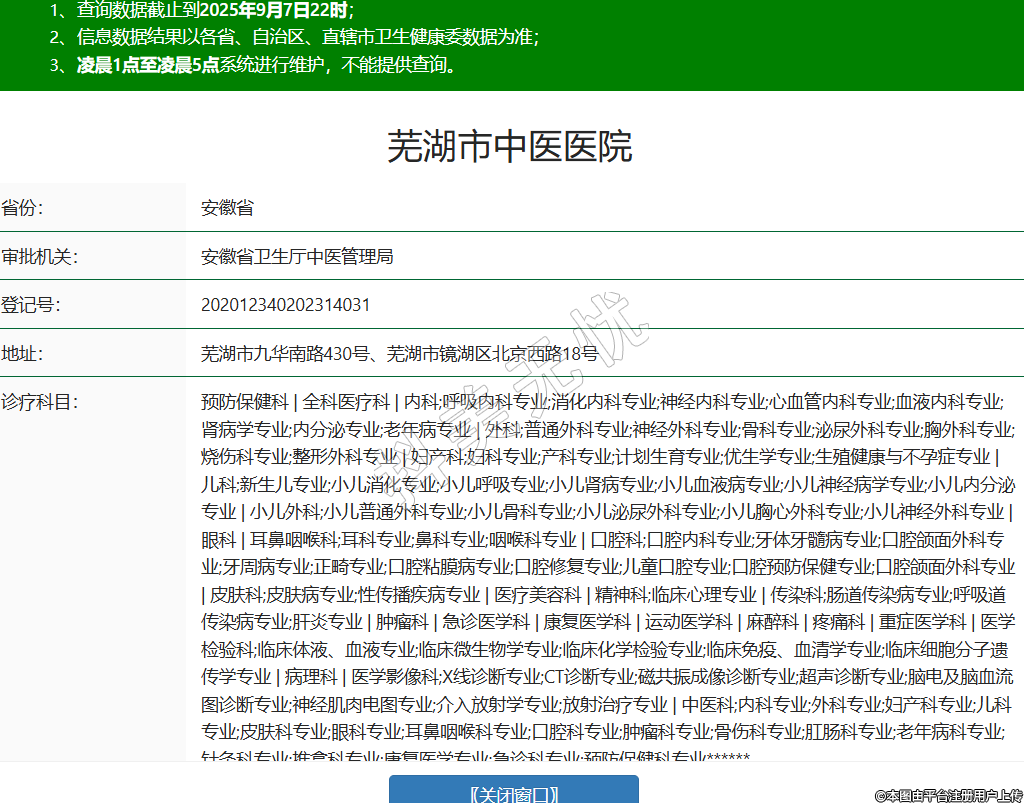 省份:安徽省審批機(jī)關(guān):安徽省衛(wèi)生廳中醫(yī)管理局登記號(hào):202012340202314031地址:蕪湖市九華南路430號(hào)、蕪湖市鏡湖區(qū)北京西路18號(hào)診療科目:預(yù)防保健科 | 全科醫(yī)療科 | 內(nèi)科;呼吸內(nèi)科專業(yè);消化內(nèi)科專業(yè);神經(jīng)內(nèi)科專業(yè);心血管內(nèi)科專業(yè);血液內(nèi)科專業(yè);腎病學(xué)專業(yè);內(nèi)分泌專業(yè);老年病專業(yè) | 外科;普通外科專業(yè);神經(jīng)外科專業(yè);骨科專業(yè);泌尿外科專業(yè);胸外科專業(yè);燒傷科專業(yè);整形外科專業(yè) | 婦產(chǎn)科;婦科專業(yè);產(chǎn)科專業(yè);計(jì)劃生育專業(yè);優(yōu)生學(xué)專業(yè);生殖健康與不孕癥專業(yè) | 兒科;新生兒專業(yè);小兒消化專業(yè);小兒呼吸專業(yè);小兒腎病專業(yè);小兒血液病專業(yè);小兒神經(jīng)病學(xué)專業(yè);小兒內(nèi)分泌專業(yè) | 小兒外科;小兒普通外科專業(yè);小兒骨科專業(yè);小兒泌尿外科專業(yè);小兒胸心外科專業(yè);小兒神經(jīng)外科專業(yè) | 眼科 | 耳鼻咽喉科;耳科專業(yè);鼻科專業(yè);咽喉科專業(yè) | 口腔科;口腔內(nèi)科專業(yè);牙體牙髓病專業(yè);口腔頜面外科專業(yè);牙周病專業(yè);正畸專業(yè);口腔粘膜病專業(yè);口腔修復(fù)專業(yè);兒童口腔專業(yè);口腔預(yù)防保健專業(yè);口腔頜面外科專業(yè) | 皮膚科;皮膚病專業(yè);性傳播疾病專業(yè) | 醫(yī)療美容科 | 精神科;臨床心理專業(yè) | 傳染科;腸道傳染病專業(yè);呼吸道傳染病專業(yè);肝炎專業(yè) | 腫瘤科 | 急診醫(yī)學(xué)科 | 康復(fù)醫(yī)學(xué)科 | 運(yùn)動(dòng)醫(yī)學(xué)科 | 麻醉科 | 疼痛科 | 重癥醫(yī)學(xué)科 | 醫(yī)學(xué)檢驗(yàn)科;臨床體液、血液專業(yè);臨床微生物學(xué)專業(yè);臨床化學(xué)檢驗(yàn)專業(yè);臨床免疫、血清學(xué)專業(yè);臨床細(xì)胞分子遺傳學(xué)專業(yè) | 病理科 | 醫(yī)學(xué)影像科;X線診斷專業(yè);CT診斷專業(yè);磁共振成像診斷專業(yè);超聲診斷專業(yè);腦電及腦血流圖診斷專業(yè);神經(jīng)肌肉電圖專業(yè);介入放射學(xué)專業(yè);放射治療專業(yè) | 中醫(yī)科;內(nèi)科專業(yè);外科專業(yè);婦產(chǎn)科專業(yè);兒科專業(yè);皮膚科專業(yè);眼科專業(yè);耳鼻咽喉科專業(yè);口腔科專業(yè);腫瘤科專業(yè);骨傷科專業(yè);肛腸科專業(yè);老年病科專業(yè);針灸科專業(yè);推拿科專業(yè);康復(fù)醫(yī)學(xué)專業(yè);急診科專業(yè);預(yù)防保健科專業(yè)******級(jí)別:三級(jí)法定代表人:劉昌闊主要負(fù)責(zé)人:劉昌闊執(zhí)業(yè)許可證有效期:2016/12/20 -至- 2031/11/30 -