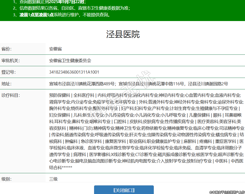 省份:安徽省審批機(jī)關(guān):安徽省衛(wèi)生健康委員會(huì)登記號(hào):34182348636001311A1001地址:宣城市涇縣涇川鎮(zhèn)桃花潭西路489號(hào);宣城市涇縣涇川鎮(zhèn)桃花潭中路116號(hào),涇縣涇川鎮(zhèn)謝園路2號(hào)診療科目:預(yù)防保健科 | 全科醫(yī)療科 | 內(nèi)科;呼吸內(nèi)科專業(yè);消化內(nèi)科專業(yè);神經(jīng)內(nèi)科專業(yè);心血管內(nèi)科專業(yè);血液內(nèi)科專業(yè);腎病學(xué)專業(yè);內(nèi)分泌專業(yè);免疫學(xué)專業(yè);老年病專業(yè) | 外科;普通外科專業(yè);神經(jīng)外科專業(yè);骨科專業(yè);泌尿外科專業(yè);胸外科專業(yè);燒傷科專業(yè);整形外科專業(yè) | 婦產(chǎn)科;婦科專業(yè);產(chǎn)科專業(yè);計(jì)劃生育專業(yè);生殖健康與不孕癥專業(yè) | 婦女保健科 | 兒科;新生兒專業(yè);小兒傳染病專業(yè);小兒消化專業(yè);小兒呼吸專業(yè) | 兒童保健科 | 眼科 | 耳鼻咽喉科;耳科專業(yè);鼻科專業(yè);咽喉科專業(yè) | 口腔科 | 皮膚科;皮膚病專業(yè);性傳播疾病專業(yè) | 醫(yī)療美容科;美容牙科;美容皮膚科 | 精神科(門診);精神病專業(yè);精神衛(wèi)生專業(yè);藥物依賴專業(yè);精神康復(fù)專業(yè);臨床心理專業(yè);司法精神專業(yè) | 傳染科;腸道傳染病專業(yè);呼吸道傳染病專業(yè);肝炎專業(yè);蟲媒傳染病專業(yè);動(dòng)物源性傳染病專業(yè);蠕蟲病專業(yè) | 結(jié)核病科 | 腫瘤科 | 急診醫(yī)學(xué)科 | 康復(fù)醫(yī)學(xué)科 | 職業(yè)病科;職業(yè)健康監(jiān)護(hù)專業(yè) | 麻醉科 | 疼痛科 | 重癥醫(yī)學(xué)科 | 醫(yī)學(xué)檢驗(yàn)科;臨床體液、血液專業(yè);臨床微生物學(xué)專業(yè);臨床化學(xué)檢驗(yàn)專業(yè);臨床免疫、血清學(xué)專業(yè);臨床細(xì)胞分子遺傳學(xué)專業(yè) | 病理科 | 醫(yī)學(xué)影像科;X線診斷專業(yè);CT診斷專業(yè);磁共振成像診斷專業(yè);核醫(yī)學(xué)專業(yè);超聲診斷專業(yè);心電診斷專業(yè);腦電及腦血流圖診斷專業(yè);神經(jīng)肌肉電圖專業(yè);介入放射學(xué)專業(yè);放射治療專業(yè) | 中醫(yī)科 | 中西醫(yī)結(jié)合科******級別:三級法定代表人:潘志剛主要負(fù)責(zé)人:潘志剛執(zhí)業(yè)許可證有效期:2023/11/17 -至- 2035/11/11 -