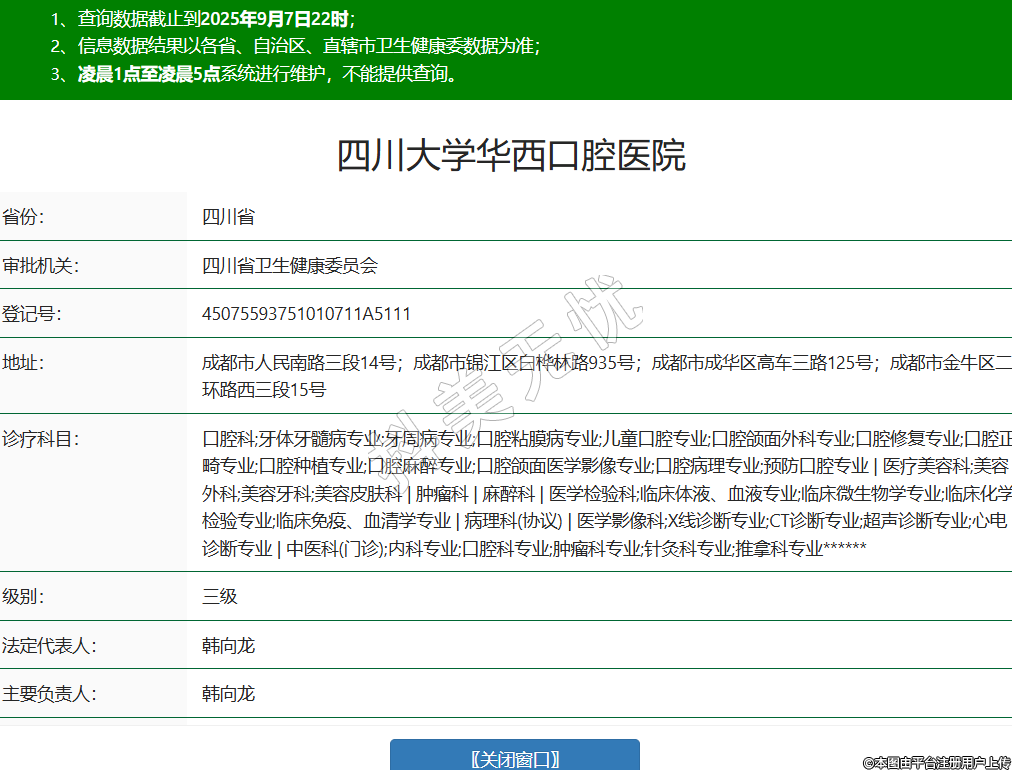 省份:四川省審批機(jī)關(guān):四川省衛(wèi)生健康委員會(huì)登記號(hào):45075593751010711A5111地址:成都市人民南路三段14號(hào);成都市錦江區(qū)白樺林路935號(hào);成都市成華區(qū)高車三路125號(hào);成都市金牛區(qū)二環(huán)路西三段15號(hào)診療科目:口腔科;牙體牙髓病專業(yè);牙周病專業(yè);口腔粘膜病專業(yè);兒童口腔專業(yè);口腔頜面外科專業(yè);口腔修復(fù)專業(yè);口腔正畸專業(yè);口腔種植專業(yè);口腔麻醉專業(yè);口腔頜面醫(yī)學(xué)影像專業(yè);口腔病理專業(yè);預(yù)防口腔專業(yè) | 醫(yī)療美容科;美容外科;美容牙科;美容皮膚科 | 腫瘤科 | 麻醉科 | 醫(yī)學(xué)檢驗(yàn)科;臨床體液、血液專業(yè);臨床微生物學(xué)專業(yè);臨床化學(xué)檢驗(yàn)專業(yè);臨床免疫、血清學(xué)專業(yè) | 病理科(協(xié)議) | 醫(yī)學(xué)影像科;X線診斷專業(yè);CT診斷專業(yè);超聲診斷專業(yè);心電診斷專業(yè) | 中醫(yī)科(門診);內(nèi)科專業(yè);口腔科專業(yè);腫瘤科專業(yè);針灸科專業(yè);推拿科專業(yè)******級(jí)別:三級(jí)法定代表人:韓向龍主要負(fù)責(zé)人:韓向龍執(zhí)業(yè)許可證有效期:2021/12/12 -至- 2036/12/11 -