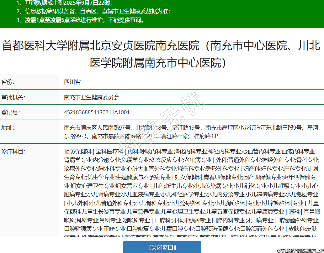 省份:四川省審批機(jī)關(guān):南充市衛(wèi)生健康委員會(huì)登記號(hào):45218368851130211A1001地址:南充市順慶區(qū)人民南路97號(hào)、北湖路118號(hào)、涪江路19號(hào),南充市高坪區(qū)小龍街道江東北路三段9號(hào)、星河?xùn)|路99號(hào),南充市嘉陵區(qū)陳壽路112號(hào)、春江路一段、桂府路33號(hào)診療科目:預(yù)防保健科 | 全科醫(yī)療科 | 內(nèi)科;呼吸內(nèi)科專業(yè);消化內(nèi)科專業(yè);神經(jīng)內(nèi)科專業(yè);心血管內(nèi)科專業(yè);血液內(nèi)科專業(yè);腎病學(xué)專業(yè);內(nèi)分泌專業(yè);免疫學(xué)專業(yè);變態(tài)反應(yīng)專業(yè);老年病專業(yè) | 外科;普通外科專業(yè);神經(jīng)外科專業(yè);骨科專業(yè);泌尿外科專業(yè);胸外科專業(yè);心臟大血管外科專業(yè);燒傷科專業(yè);整形外科專業(yè) | 婦產(chǎn)科;婦科專業(yè);產(chǎn)科專業(yè);計(jì)劃生育專業(yè);優(yōu)生學(xué)專業(yè);生殖健康與不孕癥專業(yè) | 婦女保健科;青春期保健專業(yè);圍產(chǎn)期保健專業(yè);更年期保健專業(yè);婦女心理衛(wèi)生專業(yè);婦女營(yíng)養(yǎng)專業(yè) | 兒科;新生兒專業(yè);小兒傳染病專業(yè);小兒消化專業(yè);小兒呼吸專業(yè);小兒心臟病專業(yè);小兒腎病專業(yè);小兒血液病專業(yè);小兒神經(jīng)病學(xué)專業(yè);小兒內(nèi)分泌專業(yè);小兒遺傳病專業(yè);小兒免疫專業(yè) | 小兒外科;小兒普通外科專業(yè);小兒骨科專業(yè);小兒泌尿外科專業(yè);小兒胸心外科專業(yè);小兒神經(jīng)外科專業(yè) | 兒童保健科;兒童生長(zhǎng)發(fā)育專業(yè);兒童營(yíng)養(yǎng)專業(yè);兒童心理衛(wèi)生專業(yè);兒童五官保健專業(yè);兒童康復(fù)專業(yè) | 眼科 | 耳鼻咽喉科;耳科專業(yè);鼻科專業(yè);咽喉科專業(yè) | 口腔科;牙體牙髓病專業(yè);口腔內(nèi)科專業(yè);牙周病專業(yè);口腔頜面外科專業(yè);口腔粘膜病專業(yè);正畸專業(yè);口腔修復(fù)專業(yè);兒童口腔專業(yè);口腔預(yù)防保健專業(yè);口腔頜面外科專業(yè) | 皮膚科;皮膚病專業(yè);性傳播疾病專業(yè) | 醫(yī)療美容科;美容外科;美容牙科;美容皮膚科 | 精神科;精神衛(wèi)生專業(yè);精神康復(fù)專業(yè);臨床心理專業(yè) | 傳染科;腸道傳染病專業(yè);呼吸道傳染病專業(yè);肝炎專業(yè);蟲媒傳染病專業(yè);動(dòng)物源性傳染病專業(yè);蠕蟲病專業(yè) | 結(jié)核病科 | 腫瘤科 | 急診醫(yī)學(xué)科 | 康復(fù)醫(yī)學(xué)科 | 職業(yè)病科(門診);職業(yè)中毒專業(yè)(門診);塵肺專業(yè)(門診);放射病專業(yè)(門診);物理因素?fù)p傷專業(yè)(門診);職業(yè)健康監(jiān)護(hù)專業(yè)(門診) | 麻醉科 | 疼痛科 | 重癥醫(yī)學(xué)科 | 醫(yī)學(xué)檢驗(yàn)科;臨床體液、血液專業(yè);臨床微生物學(xué)專業(yè);臨床化學(xué)檢驗(yàn)專業(yè);臨床免疫、血清學(xué)專業(yè);臨床細(xì)胞分子遺傳學(xué)專業(yè) | 病理科 | 醫(yī)學(xué)影像科;X線診斷專業(yè);CT診斷專業(yè);磁共振成像診斷專業(yè);核醫(yī)學(xué)專業(yè);超聲診斷專業(yè);心電診斷專業(yè);腦電及腦血流圖診斷專業(yè);神經(jīng)肌肉電圖專業(yè);介入放射學(xué)專業(yè);放射治療專業(yè) | 中醫(yī)科;內(nèi)科專業(yè);外科專業(yè);婦產(chǎn)科專業(yè);兒科專業(yè);眼科專業(yè);耳鼻咽喉科專業(yè);腫瘤科專業(yè);骨傷科專業(yè);肛腸科專業(yè);老年病科專業(yè);針灸科專業(yè);推拿科專業(yè);康復(fù)醫(yī)學(xué)專業(yè);急診科專業(yè) | 中西醫(yī)結(jié)合科******級(jí)別:三級(jí)法定代表人:劉楊主要負(fù)責(zé)人:劉楊執(zhí)業(yè)許可證有效期:2025/07/03 -至- 2036/09/14 -