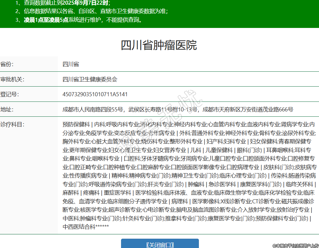 省份:四川省審批機(jī)關(guān):四川省衛(wèi)生健康委員會登記號:45073290351010711A5141地址:成都市人民南路四段55號,武侯區(qū)長壽路11號附10-13號,成都市天府新區(qū)萬安街道茂業(yè)路666號診療科目:預(yù)防保健科 | 內(nèi)科;呼吸內(nèi)科專業(yè);消化內(nèi)科專業(yè);神經(jīng)內(nèi)科專業(yè);心血管內(nèi)科專業(yè);血液內(nèi)科專業(yè);腎病學(xué)專業(yè);內(nèi)分泌專業(yè);免疫學(xué)專業(yè);變態(tài)反應(yīng)專業(yè);老年病專業(yè) | 外科;普通外科專業(yè);神經(jīng)外科專業(yè);骨科專業(yè);泌尿外科專業(yè);胸外科專業(yè);心臟大血管外科專業(yè);燒傷科專業(yè);整形外科專業(yè) | 婦產(chǎn)科;婦科專業(yè) | 婦女保健科;青春期保健專業(yè);更年期保健專業(yè);婦女心理衛(wèi)生專業(yè);婦女營養(yǎng)專業(yè) | 兒科 | 兒童保健科 | 眼科(門診) | 耳鼻咽喉科;耳科專業(yè);鼻科專業(yè);咽喉科專業(yè) | 口腔科;牙體牙髓病專業(yè);牙周病專業(yè);兒童口腔專業(yè);口腔頜面外科專業(yè);口腔修復(fù)專業(yè);口腔正畸專業(yè);口腔種植專業(yè);口腔麻醉專業(yè);口腔頜面醫(yī)學(xué)影像專業(yè);口腔病理專業(yè) | 皮膚科(門診);皮膚病專業(yè);性傳播疾病專業(yè) | 精神科;精神病專業(yè)(門診);精神衛(wèi)生專業(yè)(門診);臨床心理專業(yè)(門診) | 傳染科;腸道傳染病專業(yè)(門診);呼吸道傳染病專業(yè)(門診);肝炎專業(yè)(門診) | 腫瘤科 | 急診醫(yī)學(xué)科 | 康復(fù)醫(yī)學(xué)科(門診) | 臨終關(guān)懷科 | 麻醉科 | 疼痛科 | 重癥醫(yī)學(xué)科 | 醫(yī)學(xué)檢驗科;臨床體液、血液專業(yè);臨床微生物學(xué)專業(yè);臨床化學(xué)檢驗專業(yè);臨床免疫、血清學(xué)專業(yè);臨床細(xì)胞分子遺傳學(xué)專業(yè) | 病理科 | 醫(yī)學(xué)影像科;X線診斷專業(yè);CT診斷專業(yè);磁共振成像診斷專業(yè);核醫(yī)學(xué)專業(yè);超聲診斷專業(yè);心電診斷專業(yè);腦電及腦血流圖診斷專業(yè);介入放射學(xué)專業(yè);放射治療專業(yè) | 中醫(yī)科;腫瘤科專業(yè)(門診);針灸科專業(yè)(門診);推拿科專業(yè)(門診);康復(fù)醫(yī)學(xué)專業(yè)(門診);預(yù)防保健科專業(yè)(門診) | 中西醫(yī)結(jié)合科******級別:三級法定代表人:林桐榆主要負(fù)責(zé)人:林桐榆執(zhí)業(yè)許可證有效期:2022/01/01 -至- 2036/12/31 -