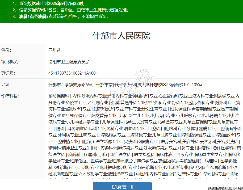 省份:四川省審批機(jī)關(guān):德陽市衛(wèi)生健康委員會登記號:45117337351068211A1001地址:什邡市方亭鎮(zhèn)安康路6號;什邡市京什東路電子科技大學(xué)什邡校區(qū)2B宿舍樓101-105室診療科目:預(yù)防保健科 | 內(nèi)科;呼吸內(nèi)科專業(yè);消化內(nèi)科專業(yè);神經(jīng)內(nèi)科專業(yè);心血管內(nèi)科專業(yè);血液內(nèi)科專業(yè);腎病學(xué)專業(yè);內(nèi)分泌專業(yè);免疫學(xué)專業(yè);老年病專業(yè) | 外科;普通外科專業(yè);神經(jīng)外科專業(yè);骨科專業(yè);泌尿外科專業(yè);胸外科專業(yè);燒傷科專業(yè);整形外科專業(yè) | 婦產(chǎn)科;婦科專業(yè);產(chǎn)科專業(yè);計劃生育專業(yè) | 婦女保健科;青春期保健專業(yè);圍產(chǎn)期保健專業(yè);更年期保健專業(yè);婦女營養(yǎng)專業(yè) | 兒科;新生兒專業(yè);小兒消化專業(yè);小兒呼吸專業(yè);小兒腎病專業(yè);小兒血液病專業(yè);小兒神經(jīng)病學(xué)專業(yè) | 兒童保健科;兒童生長發(fā)育專業(yè);兒童營養(yǎng)專業(yè);兒童五官保健專業(yè);兒童康復(fù)專業(yè) | 眼科 | 耳鼻咽喉科;耳科專業(yè);鼻科專業(yè);咽喉科專業(yè) | 口腔科;口腔內(nèi)科專業(yè);牙體牙髓病專業(yè);口腔頜面外科專業(yè);牙周病專業(yè);正畸專業(yè);口腔粘膜病專業(yè);口腔修復(fù)專業(yè);兒童口腔專業(yè);口腔預(yù)防保健專業(yè);口腔頜面外科專業(yè);口腔種植專業(yè);口腔頜面醫(yī)學(xué)影像專業(yè) | 皮膚科;皮膚病專業(yè) | 醫(yī)療美容科;美容外科;美容牙科;美容皮膚科 | 精神科;精神衛(wèi)生專業(yè)(門診) | 傳染科;腸道傳染病專業(yè);呼吸道傳染病專業(yè);肝炎專業(yè) | 腫瘤科 | 急診醫(yī)學(xué)科 | 康復(fù)醫(yī)學(xué)科 | 麻醉科 | 疼痛科(門診) | 重癥醫(yī)學(xué)科 | 醫(yī)學(xué)檢驗科;臨床體液、血液專業(yè);臨床微生物學(xué)專業(yè);臨床化學(xué)檢驗專業(yè);臨床免疫、血清學(xué)專業(yè);臨床細(xì)胞分子遺傳學(xué)專業(yè)(新型冠狀病毒核酸檢測) | 病理科 | 醫(yī)學(xué)影像科;X線診斷專業(yè);CT診斷專業(yè);磁共振成像診斷專業(yè);超聲診斷專業(yè);心電診斷專業(yè);腦電及腦血流圖診斷專業(yè);神經(jīng)肌肉電圖專業(yè);介入放射學(xué)專業(yè);放射治療專業(yè) | 中醫(yī)科;內(nèi)科專業(yè)(門診);婦產(chǎn)科專業(yè)(門診);兒科專業(yè)(門診);皮膚科專業(yè)(門診);骨傷科專業(yè)(門診);肛腸科專業(yè)(門診);針灸科專業(yè)(門診);推拿科專業(yè)(門診);康復(fù)醫(yī)學(xué)專業(yè)(門診) | 中西醫(yī)結(jié)合科******級別:三級法定代表人:劉強(qiáng)主要負(fù)責(zé)人:劉強(qiáng)執(zhí)業(yè)許可證有效期:2020/07/10 -至- 2035/07/09 -