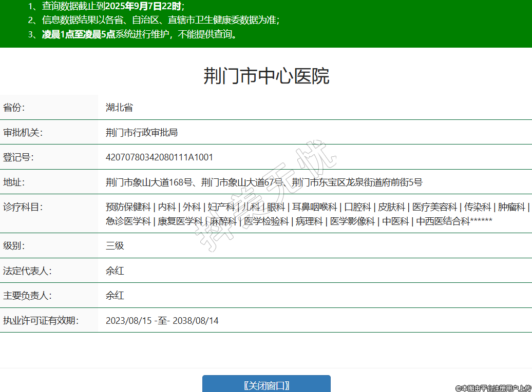 省份:湖北省審批機關(guān):荊門市行政審批局登記號:42070780342080111A1001地址:荊門市象山大道168號、荊門市象山大道67號、荊門市東寶區(qū)龍泉街道府前街5號診療科目:預(yù)防保健科 | 內(nèi)科 | 外科 | 婦產(chǎn)科 | 兒科 | 眼科 | 耳鼻咽喉科 | 口腔科 | 皮膚科 | 醫(yī)療美容科 | 傳染科 | 腫瘤科 | 急診醫(yī)學(xué)科 | 康復(fù)醫(yī)學(xué)科 | 麻醉科 | 醫(yī)學(xué)檢驗科 | 病理科 | 醫(yī)學(xué)影像科 | 中醫(yī)科 | 中西醫(yī)結(jié)合科******級別:三級法定代表人:余紅主要負(fù)責(zé)人:余紅執(zhí)業(yè)許可證有效期:2023/08/15 -至- 2038/08/14 -