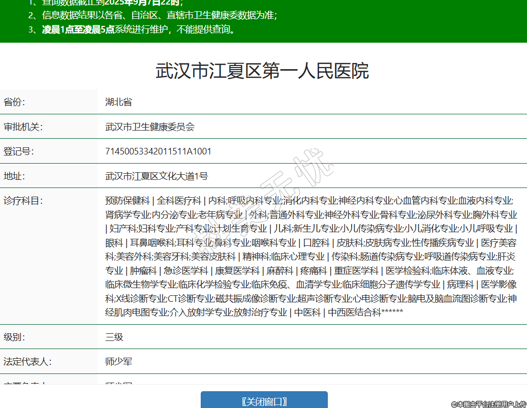 省份:湖北省審批機(jī)關(guān):武漢市衛(wèi)生健康委員會登記號:71450053342011511A1001地址:武漢市江夏區(qū)文化大道1號診療科目:預(yù)防保健科 | 全科醫(yī)療科 | 內(nèi)科;呼吸內(nèi)科專業(yè);消化內(nèi)科專業(yè);神經(jīng)內(nèi)科專業(yè);心血管內(nèi)科專業(yè);血液內(nèi)科專業(yè);腎病學(xué)專業(yè);內(nèi)分泌專業(yè);老年病專業(yè) | 外科;普通外科專業(yè);神經(jīng)外科專業(yè);骨科專業(yè);泌尿外科專業(yè);胸外科專業(yè) | 婦產(chǎn)科;婦科專業(yè);產(chǎn)科專業(yè);計(jì)劃生育專業(yè) | 兒科;新生兒專業(yè);小兒傳染病專業(yè);小兒消化專業(yè);小兒呼吸專業(yè) | 眼科 | 耳鼻咽喉科;耳科專業(yè);鼻科專業(yè);咽喉科專業(yè) | 口腔科 | 皮膚科;皮膚病專業(yè);性傳播疾病專業(yè) | 醫(yī)療美容科;美容外科;美容牙科;美容皮膚科 | 精神科;臨床心理專業(yè) | 傳染科;腸道傳染病專業(yè);呼吸道傳染病專業(yè);肝炎專業(yè) | 腫瘤科 | 急診醫(yī)學(xué)科 | 康復(fù)醫(yī)學(xué)科 | 麻醉科 | 疼痛科 | 重癥醫(yī)學(xué)科 | 醫(yī)學(xué)檢驗(yàn)科;臨床體液、血液專業(yè);臨床微生物學(xué)專業(yè);臨床化學(xué)檢驗(yàn)專業(yè);臨床免疫、血清學(xué)專業(yè);臨床細(xì)胞分子遺傳學(xué)專業(yè) | 病理科 | 醫(yī)學(xué)影像科;X線診斷專業(yè);CT診斷專業(yè);磁共振成像診斷專業(yè);超聲診斷專業(yè);心電診斷專業(yè);腦電及腦血流圖診斷專業(yè);神經(jīng)肌肉電圖專業(yè);介入放射學(xué)專業(yè);放射治療專業(yè) | 中醫(yī)科 | 中西醫(yī)結(jié)合科******級別:三級法定代表人:師少軍主要負(fù)責(zé)人:師少軍執(zhí)業(yè)許可證有效期:2018/11/08 -至- 2033/11/07 -
