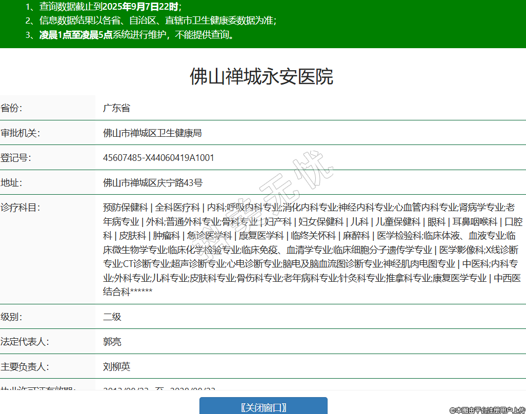 省份:廣東省審批機關(guān):佛山市禪城區(qū)衛(wèi)生健康局登記號:45607485-X44060419A1001地址:佛山市禪城區(qū)慶寧路43號診療科目:預(yù)防保健科 | 全科醫(yī)療科 | 內(nèi)科;呼吸內(nèi)科專業(yè);消化內(nèi)科專業(yè);神經(jīng)內(nèi)科專業(yè);心血管內(nèi)科專業(yè);腎病學(xué)專業(yè);老年病專業(yè) | 外科;普通外科專業(yè);骨科專業(yè) | 婦產(chǎn)科 | 婦女保健科 | 兒科 | 兒童保健科 | 眼科 | 耳鼻咽喉科 | 口腔科 | 皮膚科 | 腫瘤科 | 急診醫(yī)學(xué)科 | 康復(fù)醫(yī)學(xué)科 | 臨終關(guān)懷科 | 麻醉科 | 醫(yī)學(xué)檢驗科;臨床體液、血液專業(yè);臨床微生物學(xué)專業(yè);臨床化學(xué)檢驗專業(yè);臨床免疫、血清學(xué)專業(yè);臨床細(xì)胞分子遺傳學(xué)專業(yè) | 醫(yī)學(xué)影像科;X線診斷專業(yè);CT診斷專業(yè);超聲診斷專業(yè);心電診斷專業(yè);腦電及腦血流圖診斷專業(yè);神經(jīng)肌肉電圖專業(yè) | 中醫(yī)科;內(nèi)科專業(yè);外科專業(yè);兒科專業(yè);皮膚科專業(yè);骨傷科專業(yè);老年病科專業(yè);針灸科專業(yè);推拿科專業(yè);康復(fù)醫(yī)學(xué)專業(yè) | 中西醫(yī)結(jié)合科******級別:二級法定代表人:郭亮主要負(fù)責(zé)人:劉柳英執(zhí)業(yè)許可證有效期:2013/08/23 -至- 2028/08/23 -