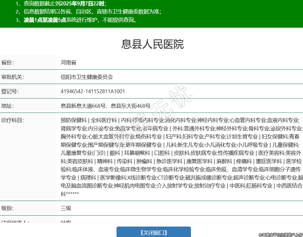 省份:河南省審批機關(guān):信陽市衛(wèi)生健康委員會登記號:41946542-141152811A1001地址:息縣新息大道668號、息縣東大街468號診療科目:預(yù)防保健科 | 全科醫(yī)療科 | 內(nèi)科;呼吸內(nèi)科專業(yè);消化內(nèi)科專業(yè);神經(jīng)內(nèi)科專業(yè);心血管內(nèi)科專業(yè);血液內(nèi)科專業(yè);腎病學(xué)專業(yè);內(nèi)分泌專業(yè);免疫學(xué)專業(yè);老年病專業(yè) | 外科;普通外科專業(yè);神經(jīng)外科專業(yè);骨科專業(yè);泌尿外科專業(yè);胸外科專業(yè);心臟大血管外科專業(yè);燒傷科專業(yè) | 婦產(chǎn)科;婦科專業(yè);產(chǎn)科專業(yè);計劃生育專業(yè) | 婦女保健科;青春期保健專業(yè);圍產(chǎn)期保健專業(yè);更年期保健專業(yè) | 兒科;新生兒專業(yè);小兒消化專業(yè);小兒呼吸專業(yè) | 兒童保健科;兒童康復(fù)專業(yè)(門診) | 眼科 | 耳鼻咽喉科 | 口腔科 | 皮膚科;皮膚病專業(yè);性傳播疾病專業(yè) | 醫(yī)療美容科;美容外科;美容皮膚科 | 精神科 | 傳染科 | 腫瘤科 | 急診醫(yī)學(xué)科 | 康復(fù)醫(yī)學(xué)科 | 麻醉科 | 疼痛科 | 重癥醫(yī)學(xué)科 | 醫(yī)學(xué)檢驗科;臨床體液、血液專業(yè);臨床微生物學(xué)專業(yè);臨床化學(xué)檢驗專業(yè);臨床免疫、血清學(xué)專業(yè);臨床細胞分子遺傳學(xué)專業(yè) | 病理科 | 醫(yī)學(xué)影像科;X線診斷專業(yè);CT診斷專業(yè);磁共振成像診斷專業(yè);超聲診斷專業(yè);心電診斷專業(yè);腦電及腦血流圖診斷專業(yè);神經(jīng)肌肉電圖專業(yè);介入放射學(xué)專業(yè);放射治療專業(yè) | 中醫(yī)科;肛腸科專業(yè) | 中西醫(yī)結(jié)合科******級別:三級法定代表人:葉梅主要負(fù)責(zé)人:***執(zhí)業(yè)許可證有效期:2025/08/20 -至- 2036/01/14 -