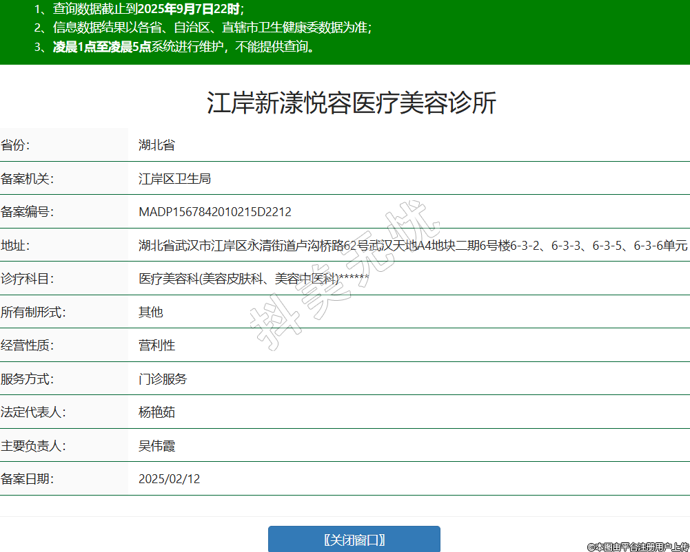 省份:湖北省備案機(jī)關(guān):江岸區(qū)衛(wèi)生局備案編號(hào):MADP1567842010215D2212地址:湖北省武漢市江岸區(qū)永清街道盧溝橋路62號(hào)武漢天地A4地塊二期6號(hào)樓6-3-2、6-3-3、6-3-5、6-3-6單元診療科目:醫(yī)療美容科(美容皮膚科、美容中醫(yī)科)******所有制形式:其他經(jīng)營(yíng)性質(zhì):營(yíng)利性服務(wù)方式:門診服務(wù)法定代表人:楊艷茹主要負(fù)責(zé)人:吳偉霞備案日期:2025/02/12 -