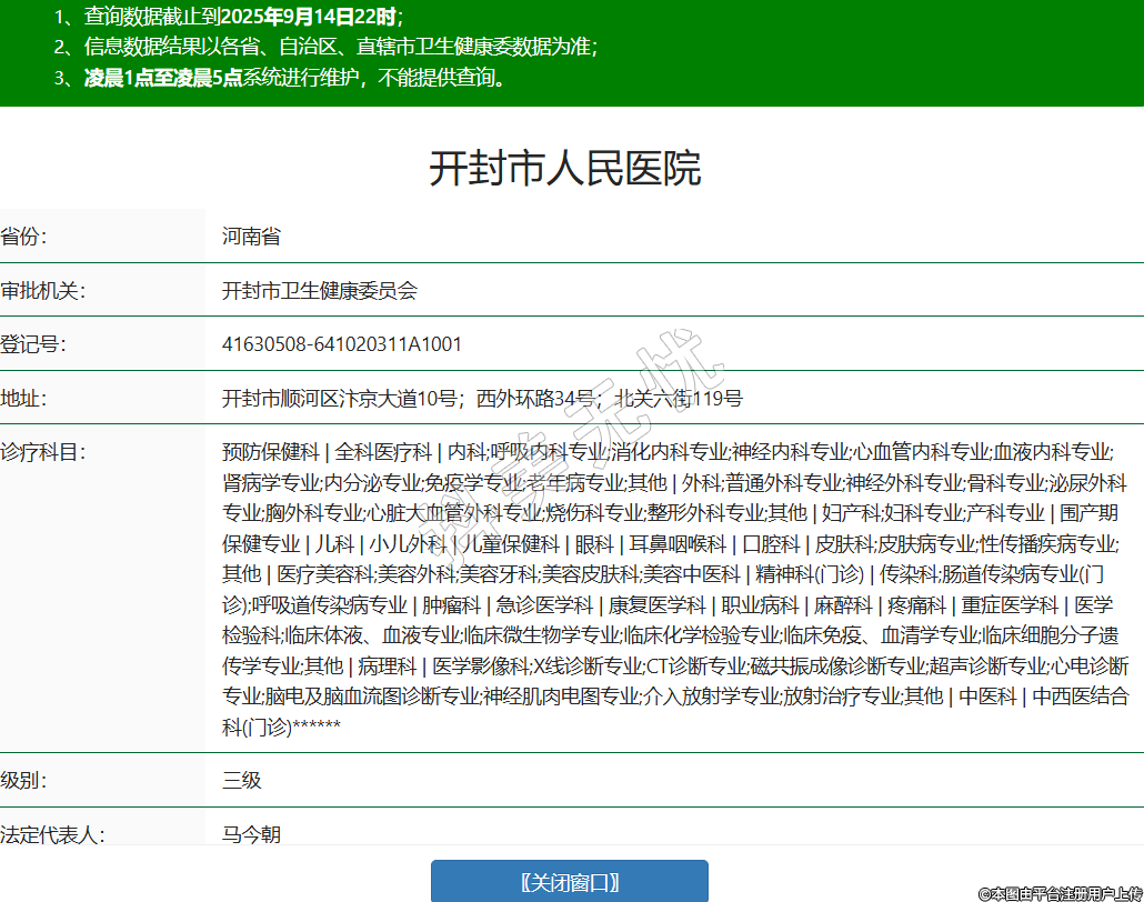 省份:河南省審批機關(guān):開封市衛(wèi)生健康委員會登記號:41630508-641020311A1001地址:開封市順河區(qū)汴京大道10號;西外環(huán)路34號;北關(guān)六街119號診療科目:預(yù)防保健科 | 全科醫(yī)療科 | 內(nèi)科;呼吸內(nèi)科專業(yè);消化內(nèi)科專業(yè);神經(jīng)內(nèi)科專業(yè);心血管內(nèi)科專業(yè);血液內(nèi)科專業(yè);腎病學(xué)專業(yè);內(nèi)分泌專業(yè);免疫學(xué)專業(yè);老年病專業(yè);其他 | 外科;普通外科專業(yè);神經(jīng)外科專業(yè);骨科專業(yè);泌尿外科專業(yè);胸外科專業(yè);心臟大血管外科專業(yè);燒傷科專業(yè);整形外科專業(yè);其他 | 婦產(chǎn)科;婦科專業(yè);產(chǎn)科專業(yè) | 圍產(chǎn)期保健專業(yè) | 兒科 | 小兒外科 | 兒童保健科 | 眼科 | 耳鼻咽喉科 | 口腔科 | 皮膚科;皮膚病專業(yè);性傳播疾病專業(yè);其他 | 醫(yī)療美容科;美容外科;美容牙科;美容皮膚科;美容中醫(yī)科 | 精神科(門診) | 傳染科;腸道傳染病專業(yè)(門診);呼吸道傳染病專業(yè) | 腫瘤科 | 急診醫(yī)學(xué)科 | 康復(fù)醫(yī)學(xué)科 | 職業(yè)病科 | 麻醉科 | 疼痛科 | 重癥醫(yī)學(xué)科 | 醫(yī)學(xué)檢驗科;臨床體液、血液專業(yè);臨床微生物學(xué)專業(yè);臨床化學(xué)檢驗專業(yè);臨床免疫、血清學(xué)專業(yè);臨床細胞分子遺傳學(xué)專業(yè);其他 | 病理科 | 醫(yī)學(xué)影像科;X線診斷專業(yè);CT診斷專業(yè);磁共振成像診斷專業(yè);超聲診斷專業(yè);心電診斷專業(yè);腦電及腦血流圖診斷專業(yè);神經(jīng)肌肉電圖專業(yè);介入放射學(xué)專業(yè);放射治療專業(yè);其他 | 中醫(yī)科 | 中西醫(yī)結(jié)合科(門診)******級別:三級法定代表人:馬今朝主要負責(zé)人:***執(zhí)業(yè)許可證有效期:2024/12/23 -至- 2033/04/07 -