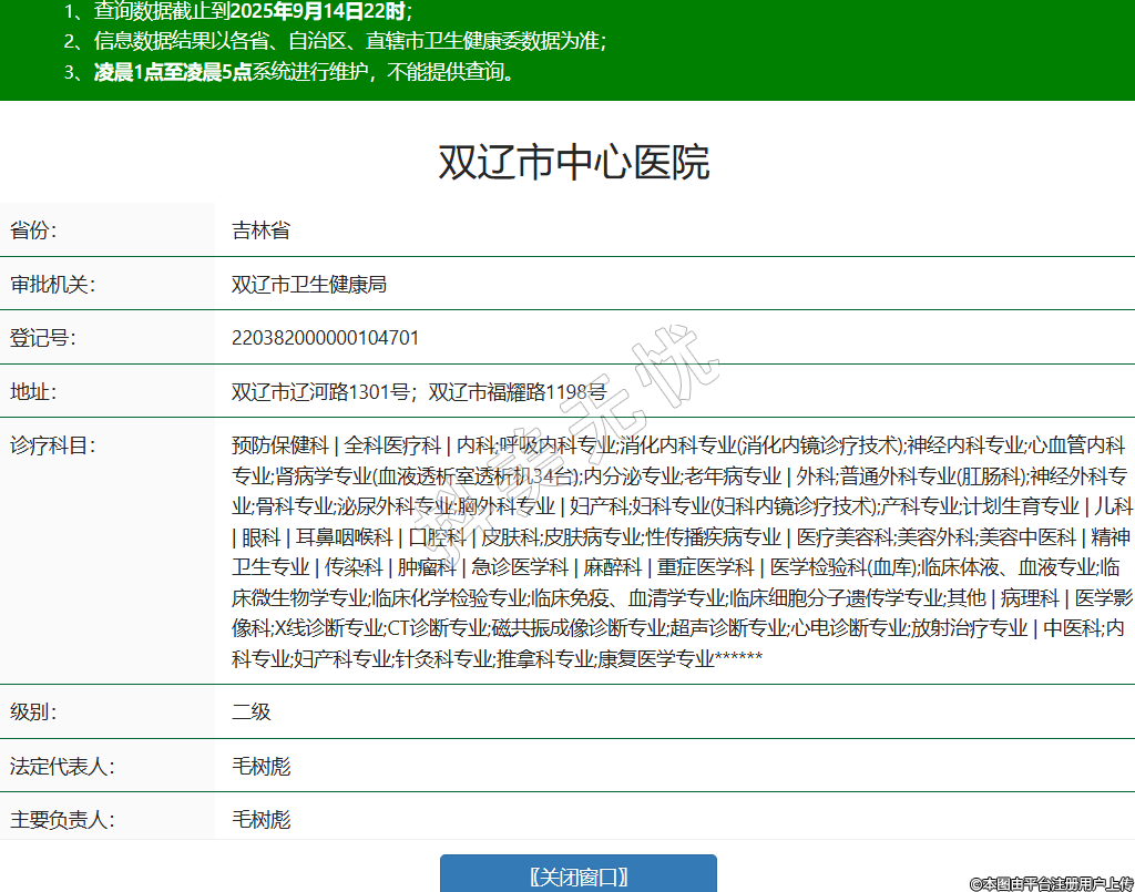 省份:吉林省審批機關(guān):雙遼市衛(wèi)生健康局登記號:220382000000104701地址:雙遼市遼河路1301號;雙遼市福耀路1198號診療科目:預(yù)防保健科 | 全科醫(yī)療科 | 內(nèi)科;呼吸內(nèi)科專業(yè);消化內(nèi)科專業(yè)(消化內(nèi)鏡診療技術(shù));神經(jīng)內(nèi)科專業(yè);心血管內(nèi)科專業(yè);腎病學(xué)專業(yè)(血液透析室透析機34臺);內(nèi)分泌專業(yè);老年病專業(yè) | 外科;普通外科專業(yè)(肛腸科);神經(jīng)外科專業(yè);骨科專業(yè);泌尿外科專業(yè);胸外科專業(yè) | 婦產(chǎn)科;婦科專業(yè)(婦科內(nèi)鏡診療技術(shù));產(chǎn)科專業(yè);計劃生育專業(yè) | 兒科 | 眼科 | 耳鼻咽喉科 | 口腔科 | 皮膚科;皮膚病專業(yè);性傳播疾病專業(yè) | 醫(yī)療美容科;美容外科;美容中醫(yī)科 | 精神衛(wèi)生專業(yè) | 傳染科 | 腫瘤科 | 急診醫(yī)學(xué)科 | 麻醉科 | 重癥醫(yī)學(xué)科 | 醫(yī)學(xué)檢驗科(血庫);臨床體液、血液專業(yè);臨床微生物學(xué)專業(yè);臨床化學(xué)檢驗專業(yè);臨床免疫、血清學(xué)專業(yè);臨床細(xì)胞分子遺傳學(xué)專業(yè);其他 | 病理科 | 醫(yī)學(xué)影像科;X線診斷專業(yè);CT診斷專業(yè);磁共振成像診斷專業(yè);超聲診斷專業(yè);心電診斷專業(yè);放射治療專業(yè) | 中醫(yī)科;內(nèi)科專業(yè);婦產(chǎn)科專業(yè);針灸科專業(yè);推拿科專業(yè);康復(fù)醫(yī)學(xué)專業(yè)******級別:二級法定代表人:毛樹彪主要負(fù)責(zé)人:毛樹彪執(zhí)業(yè)許可證有效期:2023/06/09 -至- 2026/06/09 -