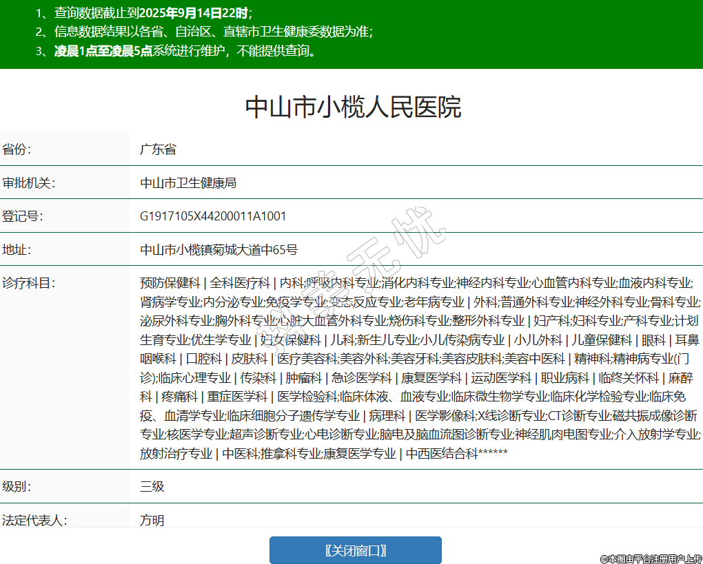 省份:廣東省審批機(jī)關(guān):中山市衛(wèi)生健康局登記號(hào):G1917105X44200011A1001地址:中山市小欖鎮(zhèn)菊城大道中65號(hào)診療科目:預(yù)防保健科 | 全科醫(yī)療科 | 內(nèi)科;呼吸內(nèi)科專(zhuān)業(yè);消化內(nèi)科專(zhuān)業(yè);神經(jīng)內(nèi)科專(zhuān)業(yè);心血管內(nèi)科專(zhuān)業(yè);血液內(nèi)科專(zhuān)業(yè);腎病學(xué)專(zhuān)業(yè);內(nèi)分泌專(zhuān)業(yè);免疫學(xué)專(zhuān)業(yè);變態(tài)反應(yīng)專(zhuān)業(yè);老年病專(zhuān)業(yè) | 外科;普通外科專(zhuān)業(yè);神經(jīng)外科專(zhuān)業(yè);骨科專(zhuān)業(yè);泌尿外科專(zhuān)業(yè);胸外科專(zhuān)業(yè);心臟大血管外科專(zhuān)業(yè);燒傷科專(zhuān)業(yè);整形外科專(zhuān)業(yè) | 婦產(chǎn)科;婦科專(zhuān)業(yè);產(chǎn)科專(zhuān)業(yè);計(jì)劃生育專(zhuān)業(yè);優(yōu)生學(xué)專(zhuān)業(yè) | 婦女保健科 | 兒科;新生兒專(zhuān)業(yè);小兒傳染病專(zhuān)業(yè) | 小兒外科 | 兒童保健科 | 眼科 | 耳鼻咽喉科 | 口腔科 | 皮膚科 | 醫(yī)療美容科;美容外科;美容牙科;美容皮膚科;美容中醫(yī)科 | 精神科;精神病專(zhuān)業(yè)(門(mén)診);臨床心理專(zhuān)業(yè) | 傳染科 | 腫瘤科 | 急診醫(yī)學(xué)科 | 康復(fù)醫(yī)學(xué)科 | 運(yùn)動(dòng)醫(yī)學(xué)科 | 職業(yè)病科 | 臨終關(guān)懷科 | 麻醉科 | 疼痛科 | 重癥醫(yī)學(xué)科 | 醫(yī)學(xué)檢驗(yàn)科;臨床體液、血液專(zhuān)業(yè);臨床微生物學(xué)專(zhuān)業(yè);臨床化學(xué)檢驗(yàn)專(zhuān)業(yè);臨床免疫、血清學(xué)專(zhuān)業(yè);臨床細(xì)胞分子遺傳學(xué)專(zhuān)業(yè) | 病理科 | 醫(yī)學(xué)影像科;X線診斷專(zhuān)業(yè);CT診斷專(zhuān)業(yè);磁共振成像診斷專(zhuān)業(yè);核醫(yī)學(xué)專(zhuān)業(yè);超聲診斷專(zhuān)業(yè);心電診斷專(zhuān)業(yè);腦電及腦血流圖診斷專(zhuān)業(yè);神經(jīng)肌肉電圖專(zhuān)業(yè);介入放射學(xué)專(zhuān)業(yè);放射治療專(zhuān)業(yè) | 中醫(yī)科;推拿科專(zhuān)業(yè);康復(fù)醫(yī)學(xué)專(zhuān)業(yè) | 中西醫(yī)結(jié)合科******級(jí)別:三級(jí)法定代表人:方明主要負(fù)責(zé)人:方明執(zhí)業(yè)許可證有效期:2024/08/02 -至- 2025/10/26 -