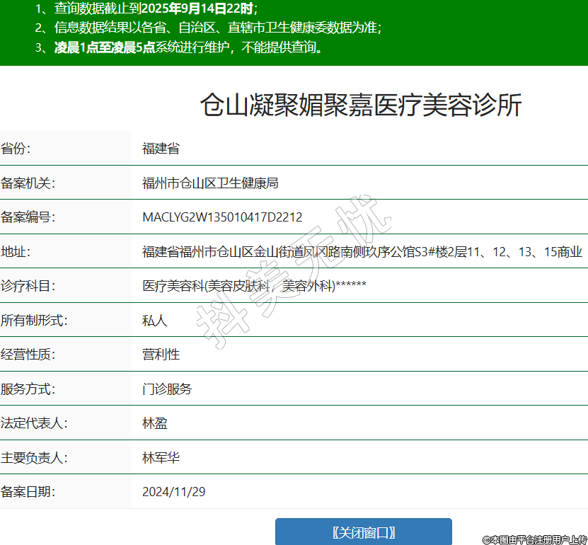 省份:福建省備案機關:福州市倉山區(qū)衛(wèi)生健康局備案編號:MACLYG2W135010417D2212地址:福建省福州市倉山區(qū)金山街道鳳岡路南側玖序公館S3#樓2層11、12、13、15商業(yè)診療科目:醫(yī)療美容科(美容皮膚科,美容外科)******所有制形式:私人經(jīng)營性質:營利性服務方式:門診服務法定代表人:林盈主要負責人:林軍華備案日期:2024/11/29 -