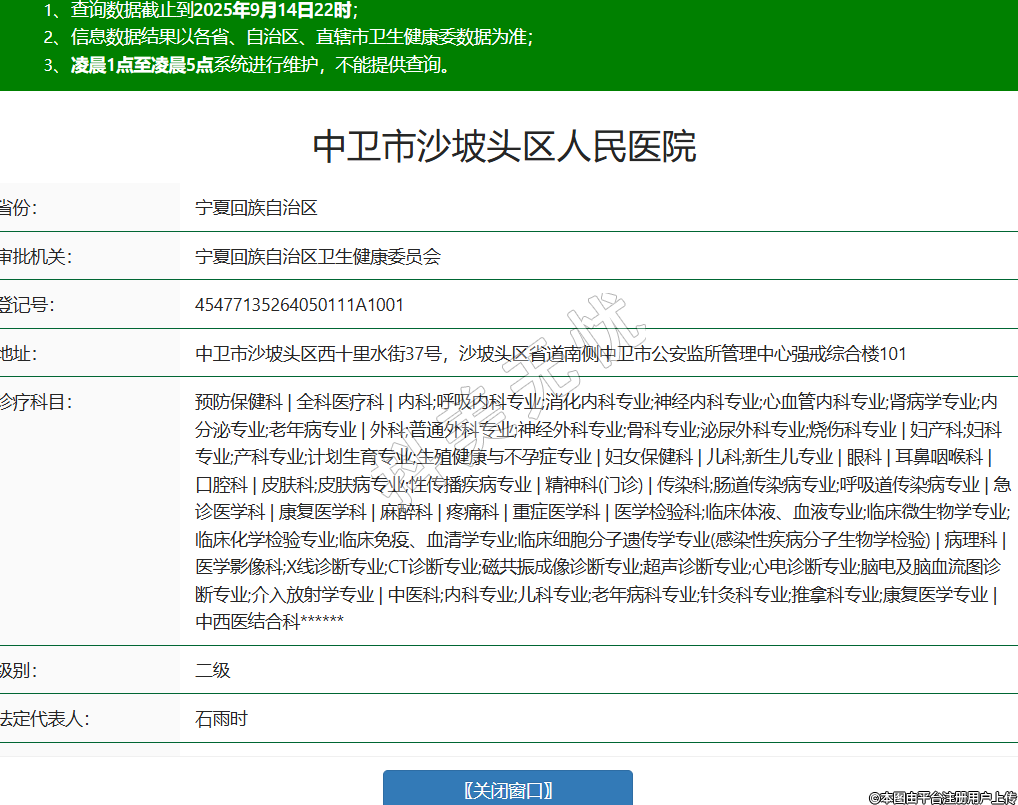省份:寧夏回族自治區(qū)審批機(jī)關(guān):寧夏回族自治區(qū)衛(wèi)生健康委員會登記號:45477135264050111A1001地址:中衛(wèi)市沙坡頭區(qū)西十里水街37號,沙坡頭區(qū)省道南側(cè)中衛(wèi)市公安監(jiān)所管理中心強(qiáng)戒綜合樓101診療科目:預(yù)防保健科 | 全科醫(yī)療科 | 內(nèi)科;呼吸內(nèi)科專業(yè);消化內(nèi)科專業(yè);神經(jīng)內(nèi)科專業(yè);心血管內(nèi)科專業(yè);腎病學(xué)專業(yè);內(nèi)分泌專業(yè);老年病專業(yè) | 外科;普通外科專業(yè);神經(jīng)外科專業(yè);骨科專業(yè);泌尿外科專業(yè);燒傷科專業(yè) | 婦產(chǎn)科;婦科專業(yè);產(chǎn)科專業(yè);計(jì)劃生育專業(yè);生殖健康與不孕癥專業(yè) | 婦女保健科 | 兒科;新生兒專業(yè) | 眼科 | 耳鼻咽喉科 | 口腔科 | 皮膚科;皮膚病專業(yè);性傳播疾病專業(yè) | 精神科(門診) | 傳染科;腸道傳染病專業(yè);呼吸道傳染病專業(yè) | 急診醫(yī)學(xué)科 | 康復(fù)醫(yī)學(xué)科 | 麻醉科 | 疼痛科 | 重癥醫(yī)學(xué)科 | 醫(yī)學(xué)檢驗(yàn)科;臨床體液、血液專業(yè);臨床微生物學(xué)專業(yè);臨床化學(xué)檢驗(yàn)專業(yè);臨床免疫、血清學(xué)專業(yè);臨床細(xì)胞分子遺傳學(xué)專業(yè)(感染性疾病分子生物學(xué)檢驗(yàn)) | 病理科 | 醫(yī)學(xué)影像科;X線診斷專業(yè);CT診斷專業(yè);磁共振成像診斷專業(yè);超聲診斷專業(yè);心電診斷專業(yè);腦電及腦血流圖診斷專業(yè);介入放射學(xué)專業(yè) | 中醫(yī)科;內(nèi)科專業(yè);兒科專業(yè);老年病科專業(yè);針灸科專業(yè);推拿科專業(yè);康復(fù)醫(yī)學(xué)專業(yè) | 中西醫(yī)結(jié)合科******級別:二級法定代表人:石雨時(shí)主要負(fù)責(zé)人:石雨時(shí)執(zhí)業(yè)許可證有效期:2024/07/01 -至- 2039/06/30 -