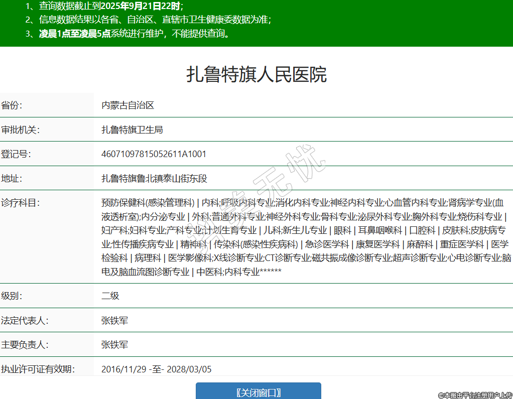省份:內(nèi)蒙古自治區(qū)審批機(jī)關(guān):扎魯特旗衛(wèi)生局登記號(hào):46071097815052611A1001地址:扎魯特旗魯北鎮(zhèn)泰山街東段診療科目:預(yù)防保健科(感染管理科) | 內(nèi)科;呼吸內(nèi)科專業(yè);消化內(nèi)科專業(yè);神經(jīng)內(nèi)科專業(yè);心血管內(nèi)科專業(yè);腎病學(xué)專業(yè)(血液透析室);內(nèi)分泌專業(yè) | 外科;普通外科專業(yè);神經(jīng)外科專業(yè);骨科專業(yè);泌尿外科專業(yè);胸外科專業(yè);燒傷科專業(yè) | 婦產(chǎn)科;婦科專業(yè);產(chǎn)科專業(yè);計(jì)劃生育專業(yè) | 兒科;新生兒專業(yè) | 眼科 | 耳鼻咽喉科 | 口腔科 | 皮膚科;皮膚病專業(yè);性傳播疾病專業(yè) | 精神科 | 傳染科(感染性疾病科) | 急診醫(yī)學(xué)科 | 康復(fù)醫(yī)學(xué)科 | 麻醉科 | 重癥醫(yī)學(xué)科 | 醫(yī)學(xué)檢驗(yàn)科 | 病理科 | 醫(yī)學(xué)影像科;X線診斷專業(yè);CT診斷專業(yè);磁共振成像診斷專業(yè);超聲診斷專業(yè);心電診斷專業(yè);腦電及腦血流圖診斷專業(yè) | 中醫(yī)科;內(nèi)科專業(yè)******級(jí)別:二級(jí)法定代表人:張鐵軍主要負(fù)責(zé)人:張鐵軍執(zhí)業(yè)許可證有效期:2016/11/29 -至- 2028/03/05 -
