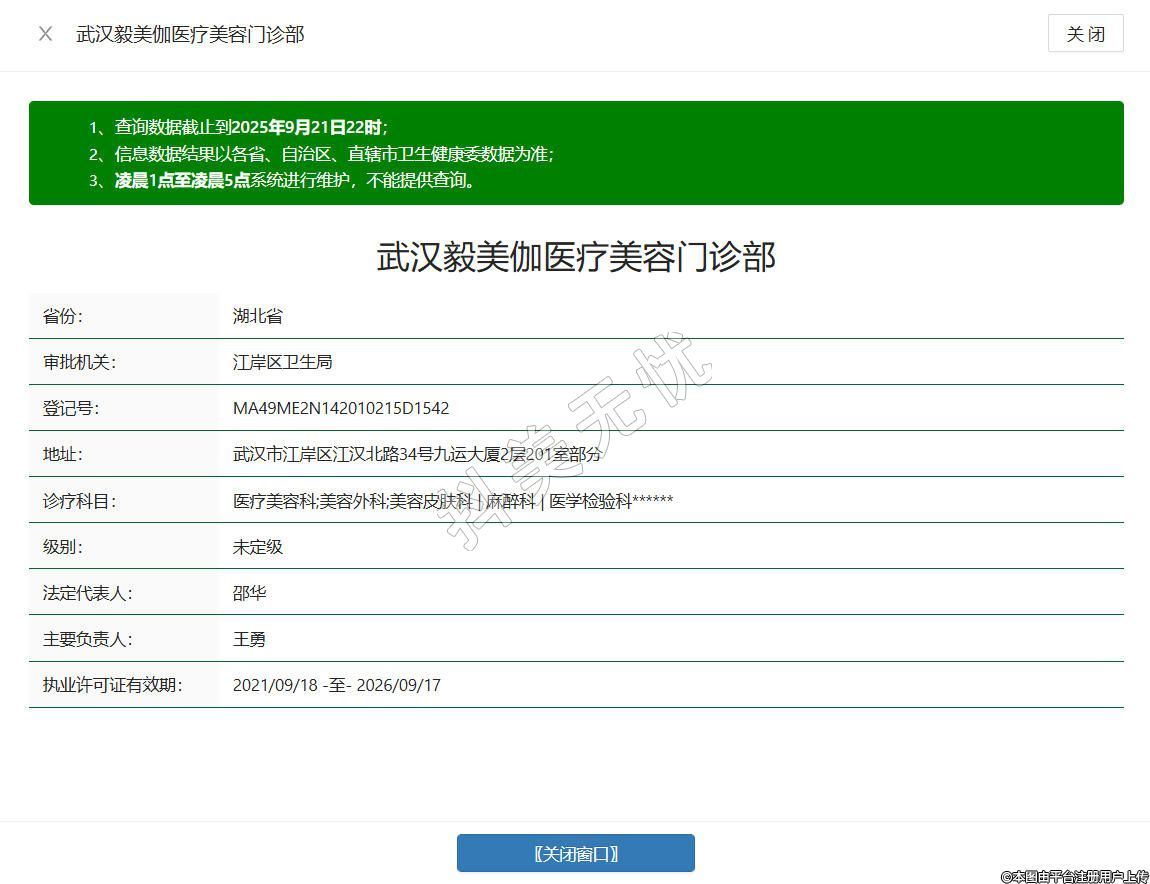 武漢毅美伽醫(yī)療美容門診部成立于2020年,位于武漢市江岸區(qū)江漢北路34號九運(yùn)大廈2層201室部分,是經(jīng)衛(wèi)生部門批準(zhǔn)成立的正規(guī)醫(yī)美機(jī)構(gòu),配備標(biāo)準(zhǔn)的手術(shù)室及VIP病房,設(shè)有抗衰、美容外科、美容皮膚科等多個科室,涵蓋眼鼻整形、吸脂塑形、祛斑嫩膚等多元項目,秉持自然個性的審美主張,為求美者提供規(guī)范診療服務(wù)。