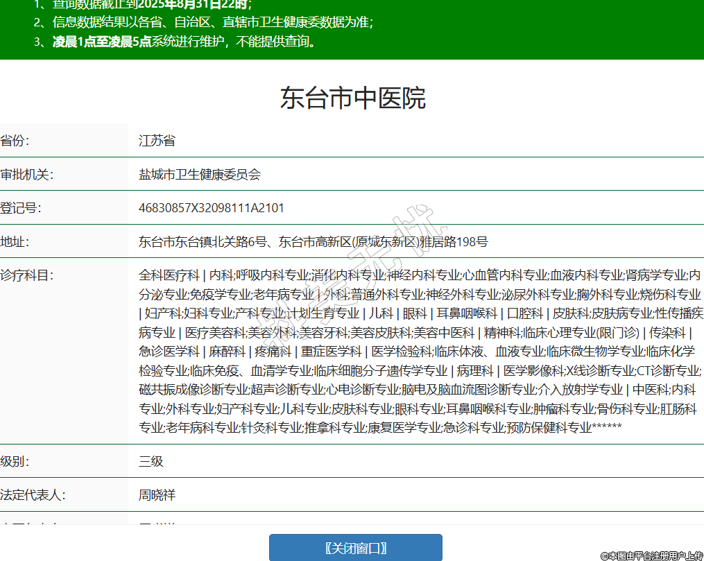 省份:江蘇省審批機關(guān):鹽城市衛(wèi)生健康委員會登記號:46830857X32098111A2101地址:東臺市東臺鎮(zhèn)北關(guān)路6號、東臺市高新區(qū)(原城東新區(qū))雅居路198號診療科目:全科醫(yī)療科 | 內(nèi)科;呼吸內(nèi)科專業(yè);消化內(nèi)科專業(yè);神經(jīng)內(nèi)科專業(yè);心血管內(nèi)科專業(yè);血液內(nèi)科專業(yè);腎病學(xué)專業(yè);內(nèi)分泌專業(yè);免疫學(xué)專業(yè);老年病專業(yè) | 外科;普通外科專業(yè);神經(jīng)外科專業(yè);泌尿外科專業(yè);胸外科專業(yè);燒傷科專業(yè) | 婦產(chǎn)科;婦科專業(yè);產(chǎn)科專業(yè);計劃生育專業(yè) | 兒科 | 眼科 | 耳鼻咽喉科 | 口腔科 | 皮膚科;皮膚病專業(yè);性傳播疾病專業(yè) | 醫(yī)療美容科;美容外科;美容牙科;美容皮膚科;美容中醫(yī)科 | 精神科;臨床心理專業(yè)(限門診) | 傳染科 | 急診醫(yī)學(xué)科 | 麻醉科 | 疼痛科 | 重癥醫(yī)學(xué)科 | 醫(yī)學(xué)檢驗科;臨床體液、血液專業(yè);臨床微生物學(xué)專業(yè);臨床化學(xué)檢驗專業(yè);臨床免疫、血清學(xué)專業(yè);臨床細(xì)胞分子遺傳學(xué)專業(yè) | 病理科 | 醫(yī)學(xué)影像科;X線診斷專業(yè);CT診斷專業(yè);磁共振成像診斷專業(yè);超聲診斷專業(yè);心電診斷專業(yè);腦電及腦血流圖診斷專業(yè);介入放射學(xué)專業(yè) | 中醫(yī)科;內(nèi)科專業(yè);外科專業(yè);婦產(chǎn)科專業(yè);兒科專業(yè);皮膚科專業(yè);眼科專業(yè);耳鼻咽喉科專業(yè);腫瘤科專業(yè);骨傷科專業(yè);肛腸科專業(yè);老年病科專業(yè);針灸科專業(yè);推拿科專業(yè);康復(fù)醫(yī)學(xué)專業(yè);急診科專業(yè);預(yù)防保健科專業(yè)******級別:三級法定代表人:周曉祥主要負(fù)責(zé)人:周曉祥執(zhí)業(yè)許可證有效期:2020/04/23 -至- 2035/04/22 -