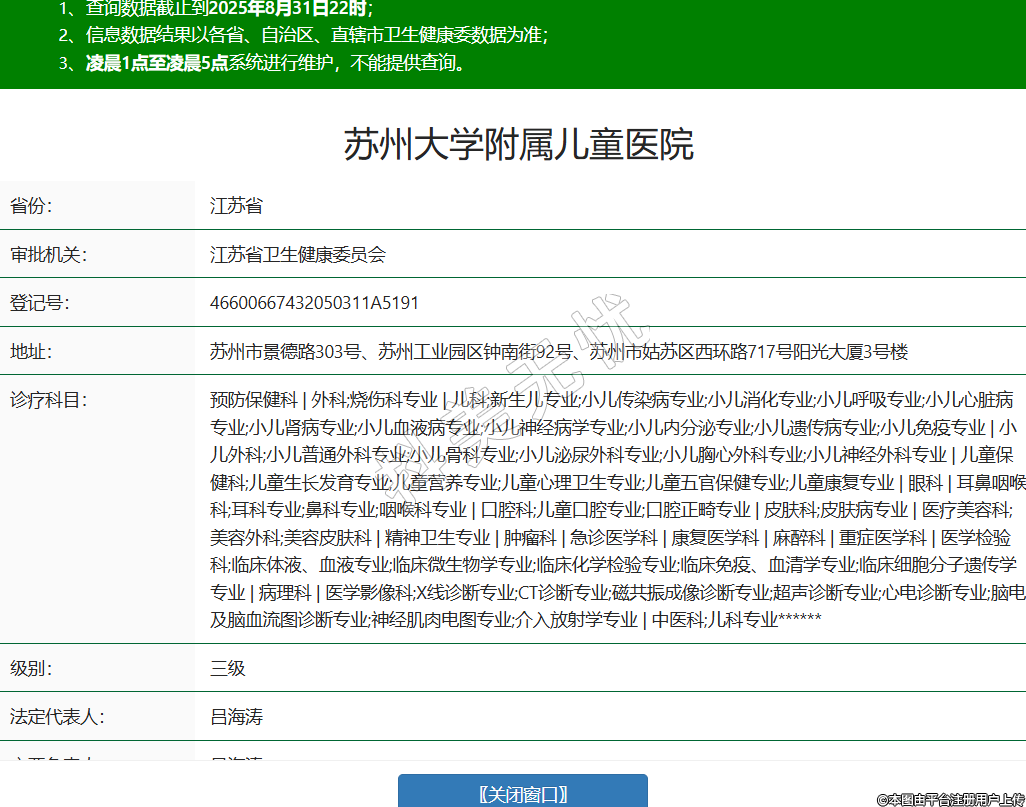省份:江蘇省審批機(jī)關(guān):江蘇省衛(wèi)生健康委員會登記號:46600667432050311A5191地址:蘇州市景德路303號、蘇州工業(yè)園區(qū)鐘南街92號、蘇州市姑蘇區(qū)西環(huán)路717號陽光大廈3號樓診療科目:預(yù)防保健科 | 外科;燒傷科專業(yè) | 兒科;新生兒專業(yè);小兒傳染病專業(yè);小兒消化專業(yè);小兒呼吸專業(yè);小兒心臟病專業(yè);小兒腎病專業(yè);小兒血液病專業(yè);小兒神經(jīng)病學(xué)專業(yè);小兒內(nèi)分泌專業(yè);小兒遺傳病專業(yè);小兒免疫專業(yè) | 小兒外科;小兒普通外科專業(yè);小兒骨科專業(yè);小兒泌尿外科專業(yè);小兒胸心外科專業(yè);小兒神經(jīng)外科專業(yè) | 兒童保健科;兒童生長發(fā)育專業(yè);兒童營養(yǎng)專業(yè);兒童心理衛(wèi)生專業(yè);兒童五官保健專業(yè);兒童康復(fù)專業(yè) | 眼科 | 耳鼻咽喉科;耳科專業(yè);鼻科專業(yè);咽喉科專業(yè) | 口腔科;兒童口腔專業(yè);口腔正畸專業(yè) | 皮膚科;皮膚病專業(yè) | 醫(yī)療美容科;美容外科;美容皮膚科 | 精神衛(wèi)生專業(yè) | 腫瘤科 | 急診醫(yī)學(xué)科 | 康復(fù)醫(yī)學(xué)科 | 麻醉科 | 重癥醫(yī)學(xué)科 | 醫(yī)學(xué)檢驗(yàn)科;臨床體液、血液專業(yè);臨床微生物學(xué)專業(yè);臨床化學(xué)檢驗(yàn)專業(yè);臨床免疫、血清學(xué)專業(yè);臨床細(xì)胞分子遺傳學(xué)專業(yè) | 病理科 | 醫(yī)學(xué)影像科;X線診斷專業(yè);CT診斷專業(yè);磁共振成像診斷專業(yè);超聲診斷專業(yè);心電診斷專業(yè);腦電及腦血流圖診斷專業(yè);神經(jīng)肌肉電圖專業(yè);介入放射學(xué)專業(yè) | 中醫(yī)科;兒科專業(yè)******級別:三級法定代表人:呂海濤主要負(fù)責(zé)人:呂海濤執(zhí)業(yè)許可證有效期:2020/12/09 -至- 2035/12/08 -