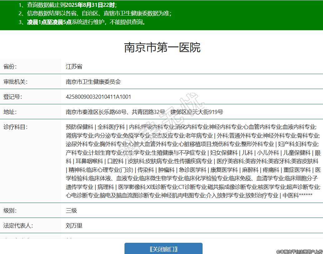 省份:江蘇省審批機(jī)關(guān):南京市衛(wèi)生健康委員會(huì)登記號(hào):42580090032010411A1001地址:南京市秦淮區(qū)長(zhǎng)樂(lè)路68號(hào)、共青團(tuán)路32號(hào)、建鄴區(qū)應(yīng)天大街919號(hào)診療科目:預(yù)防保健科 | 全科醫(yī)療科 | 內(nèi)科;呼吸內(nèi)科專業(yè);消化內(nèi)科專業(yè);神經(jīng)內(nèi)科專業(yè);心血管內(nèi)科專業(yè);血液內(nèi)科專業(yè);腎病學(xué)專業(yè);內(nèi)分泌專業(yè);免疫學(xué)專業(yè);變態(tài)反應(yīng)專業(yè);老年病專業(yè) | 外科;普通外科專業(yè);神經(jīng)外科專業(yè);骨科專業(yè);泌尿外科專業(yè);胸外科專業(yè);心臟大血管外科專業(yè);心臟移植項(xiàng)目;燒傷科專業(yè);整形外科專業(yè) | 婦產(chǎn)科;婦科專業(yè);產(chǎn)科專業(yè);計(jì)劃生育專業(yè);優(yōu)生學(xué)專業(yè);生殖健康與不孕癥專業(yè) | 婦女保健科 | 兒科 | 小兒外科 | 兒童保健科 | 眼科 | 耳鼻咽喉科 | 口腔科 | 皮膚科;皮膚病專業(yè);性傳播疾病專業(yè) | 醫(yī)療美容科;美容外科;美容牙科;美容皮膚科 | 精神科;臨床心理專業(yè)(門診) | 傳染科 | 腫瘤科 | 急診醫(yī)學(xué)科 | 康復(fù)醫(yī)學(xué)科 | 麻醉科 | 疼痛科 | 重癥醫(yī)學(xué)科 | 醫(yī)學(xué)檢驗(yàn)科;臨床體液、血液專業(yè);臨床微生物學(xué)專業(yè);臨床化學(xué)檢驗(yàn)專業(yè);臨床免疫、血清學(xué)專業(yè);臨床細(xì)胞分子遺傳學(xué)專業(yè) | 病理科 | 醫(yī)學(xué)影像科;X線診斷專業(yè);CT診斷專業(yè);磁共振成像診斷專業(yè);核醫(yī)學(xué)專業(yè);超聲診斷專業(yè);心電診斷專業(yè);腦電及腦血流圖診斷專業(yè);神經(jīng)肌肉電圖專業(yè);介入放射學(xué)專業(yè);放射治療專業(yè) | 中醫(yī)科******級(jí)別:三級(jí)法定代表人:劉萬(wàn)里主要負(fù)責(zé)人:劉萬(wàn)里執(zhí)業(yè)許可證有效期:2023/01/18 -至- 2035/02/04 -