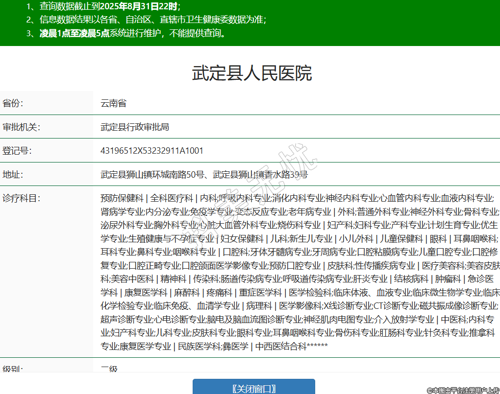省份:云南省審批機(jī)關(guān):武定縣行政審批局登記號:43196512X53232911A1001地址:武定縣獅山鎮(zhèn)環(huán)城南路50號、武定縣獅山鎮(zhèn)香水路39號診療科目:預(yù)防保健科 | 全科醫(yī)療科 | 內(nèi)科;呼吸內(nèi)科專業(yè);消化內(nèi)科專業(yè);神經(jīng)內(nèi)科專業(yè);心血管內(nèi)科專業(yè);血液內(nèi)科專業(yè);腎病學(xué)專業(yè);內(nèi)分泌專業(yè);免疫學(xué)專業(yè);變態(tài)反應(yīng)專業(yè);老年病專業(yè) | 外科;普通外科專業(yè);神經(jīng)外科專業(yè);骨科專業(yè);泌尿外科專業(yè);胸外科專業(yè);心臟大血管外科專業(yè);燒傷科專業(yè) | 婦產(chǎn)科;婦科專業(yè);產(chǎn)科專業(yè);計(jì)劃生育專業(yè);優(yōu)生學(xué)專業(yè);生殖健康與不孕癥專業(yè) | 婦女保健科 | 兒科;新生兒專業(yè) | 小兒外科 | 兒童保健科 | 眼科 | 耳鼻咽喉科;耳科專業(yè);鼻科專業(yè);咽喉科專業(yè) | 口腔科;牙體牙髓病專業(yè);牙周病專業(yè);口腔粘膜病專業(yè);兒童口腔專業(yè);口腔修復(fù)專業(yè);口腔正畸專業(yè);口腔頜面醫(yī)學(xué)影像專業(yè);預(yù)防口腔專業(yè) | 皮膚科;性傳播疾病專業(yè) | 醫(yī)療美容科;美容皮膚科;美容中醫(yī)科 | 精神科 | 傳染科;腸道傳染病專業(yè);呼吸道傳染病專業(yè);肝炎專業(yè) | 結(jié)核病科 | 腫瘤科 | 急診醫(yī)學(xué)科 | 康復(fù)醫(yī)學(xué)科 | 麻醉科 | 疼痛科 | 重癥醫(yī)學(xué)科 | 醫(yī)學(xué)檢驗(yàn)科;臨床體液、血液專業(yè);臨床微生物學(xué)專業(yè);臨床化學(xué)檢驗(yàn)專業(yè);臨床免疫、血清學(xué)專業(yè) | 病理科 | 醫(yī)學(xué)影像科;X線診斷專業(yè);CT診斷專業(yè);磁共振成像診斷專業(yè);超聲診斷專業(yè);心電診斷專業(yè);腦電及腦血流圖診斷專業(yè);神經(jīng)肌肉電圖專業(yè);介入放射學(xué)專業(yè) | 中醫(yī)科;內(nèi)科專業(yè);婦產(chǎn)科專業(yè);兒科專業(yè);皮膚科專業(yè);眼科專業(yè);耳鼻咽喉科專業(yè);骨傷科專業(yè);肛腸科專業(yè);針灸科專業(yè);推拿科專業(yè);康復(fù)醫(yī)學(xué)專業(yè) | 民族醫(yī)學(xué)科;彝醫(yī)學(xué) | 中西醫(yī)結(jié)合科******級別:二級法定代表人:閆浩主要負(fù)責(zé)人:閆浩執(zhí)業(yè)許可證有效期:2024/12/10 -至- 2037/12/31 -