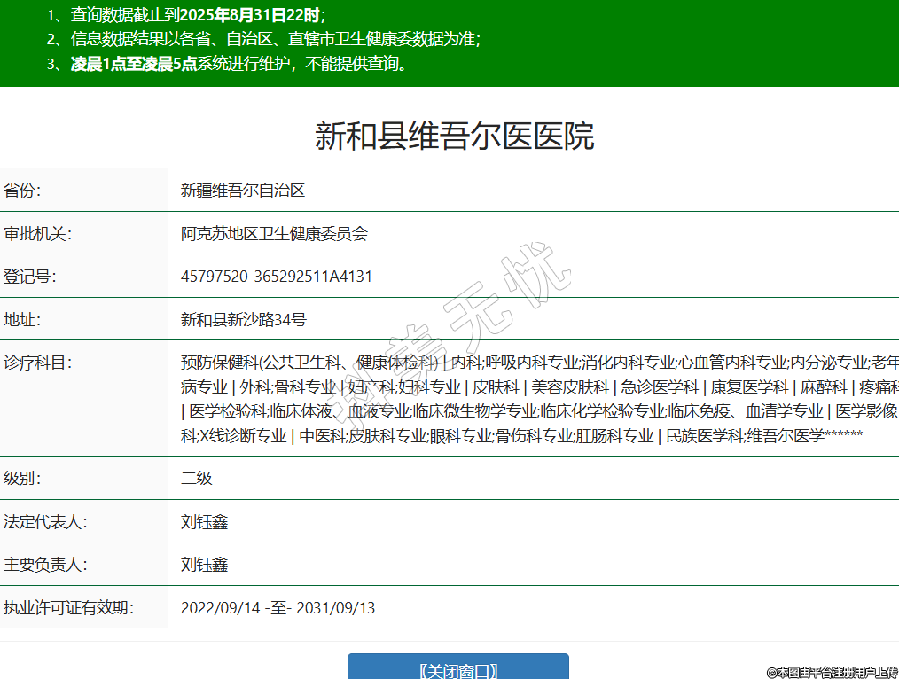 省份:新疆維吾爾自治區(qū)審批機關(guān):阿克蘇地區(qū)衛(wèi)生健康委員會登記號:45797520-365292511A4131地址:新和縣新沙路34號診療科目:預防保健科(公共衛(wèi)生科、健康體檢科) | 內(nèi)科;呼吸內(nèi)科專業(yè);消化內(nèi)科專業(yè);心血管內(nèi)科專業(yè);內(nèi)分泌專業(yè);老年病專業(yè) | 外科;骨科專業(yè) | 婦產(chǎn)科;婦科專業(yè) | 皮膚科 | 美容皮膚科 | 急診醫(yī)學科 | 康復醫(yī)學科 | 麻醉科 | 疼痛科 | 醫(yī)學檢驗科;臨床體液、血液專業(yè);臨床微生物學專業(yè);臨床化學檢驗專業(yè);臨床免疫、血清學專業(yè) | 醫(yī)學影像科;X線診斷專業(yè) | 中醫(yī)科;皮膚科專業(yè);眼科專業(yè);骨傷科專業(yè);肛腸科專業(yè) | 民族醫(yī)學科;維吾爾醫(yī)學******級別:二級法定代表人:劉鈺鑫主要負責人:劉鈺鑫執(zhí)業(yè)許可證有效期:2022/09/14 -至- 2031/09/13 -