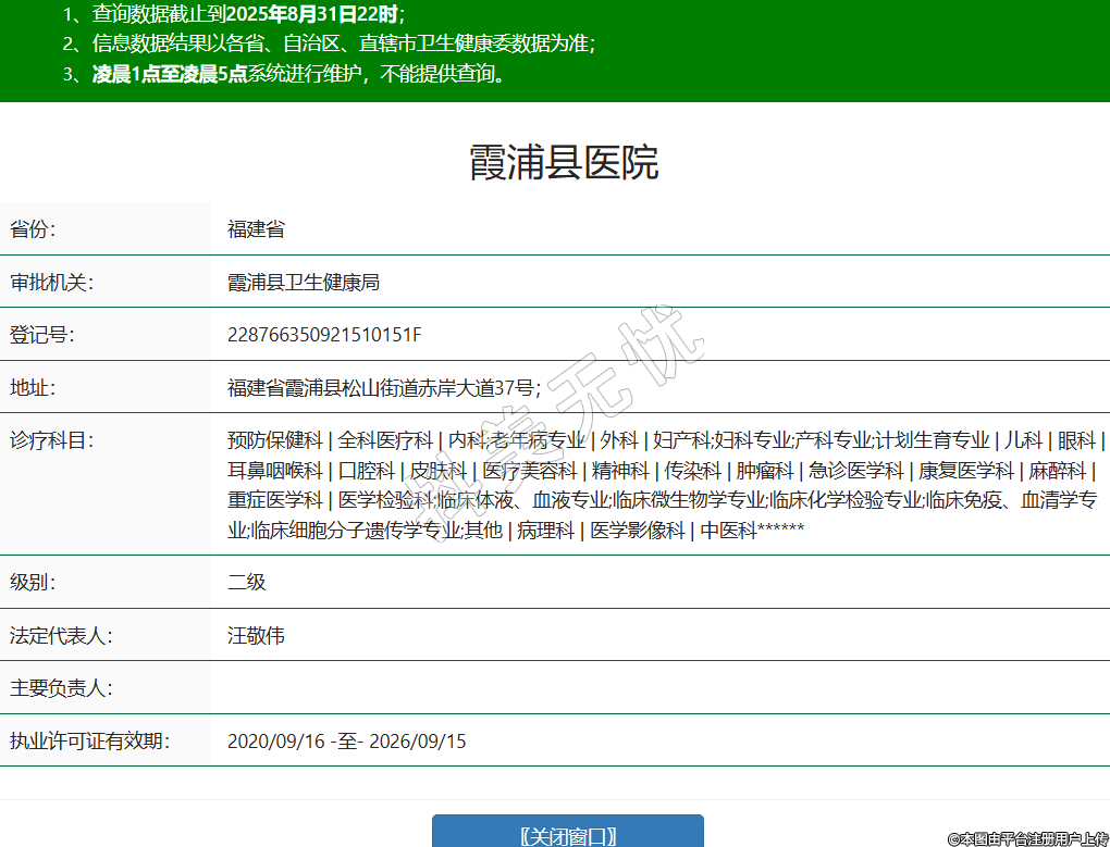 省份:福建省審批機(jī)關(guān):霞浦縣衛(wèi)生健康局登記號(hào):228766350921510151F地址:福建省霞浦縣松山街道赤岸大道37號(hào);診療科目:預(yù)防保健科 | 全科醫(yī)療科 | 內(nèi)科;老年病專(zhuān)業(yè) | 外科 | 婦產(chǎn)科;婦科專(zhuān)業(yè);產(chǎn)科專(zhuān)業(yè);計(jì)劃生育專(zhuān)業(yè) | 兒科 | 眼科 | 耳鼻咽喉科 | 口腔科 | 皮膚科 | 醫(yī)療美容科 | 精神科 | 傳染科 | 腫瘤科 | 急診醫(yī)學(xué)科 | 康復(fù)醫(yī)學(xué)科 | 麻醉科 | 重癥醫(yī)學(xué)科 | 醫(yī)學(xué)檢驗(yàn)科;臨床體液、血液專(zhuān)業(yè);臨床微生物學(xué)專(zhuān)業(yè);臨床化學(xué)檢驗(yàn)專(zhuān)業(yè);臨床免疫、血清學(xué)專(zhuān)業(yè);臨床細(xì)胞分子遺傳學(xué)專(zhuān)業(yè);其他 | 病理科 | 醫(yī)學(xué)影像科 | 中醫(yī)科******級(jí)別:二級(jí)法定代表人:汪敬偉主要負(fù)責(zé)人:執(zhí)業(yè)許可證有效期:2020/09/16 -至- 2026/09/15 -