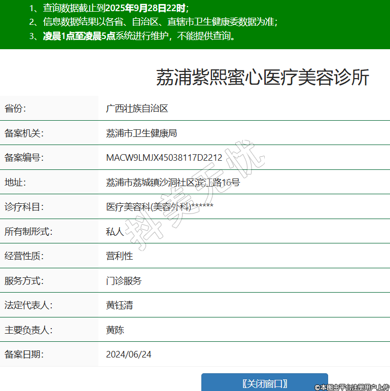 省份:廣西壯族自治區(qū)備案機(jī)關(guān):荔浦市衛(wèi)生健康局備案編號(hào):MACW9LMJX45038117D2212地址:荔浦市荔城鎮(zhèn)沙洞社區(qū)濱江路16號(hào)診療科目:醫(yī)療美容科(美容外科)******所有制形式:私人經(jīng)營(yíng)性質(zhì):營(yíng)利性服務(wù)方式:門診服務(wù)法定代表人:黃鈺清主要負(fù)責(zé)人:黃陳備案日期:2024/06/24 -