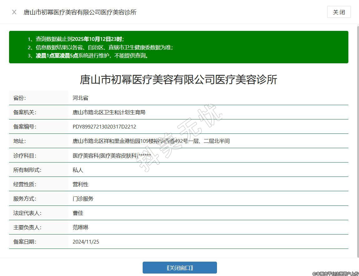 唐山初冪醫(yī)療美容診所成立于2024年,位于唐山市路北區(qū)祥和里金港怡園109樓裕華西道492號一層、二層北半間,是經(jīng)唐山市衛(wèi)健局審核批準的規(guī)范化醫(yī)療美容機構,秉持 “嚴選醫(yī)美、品質醫(yī)美、定制醫(yī)美” 的經(jīng)營理念,依托專業(yè)醫(yī)師團隊,為求美者提供皮膚治療、微整形等多元服務。環(huán)境規(guī)范舒適,以專業(yè)醫(yī)療標準為基石,兼顧服務溫度,切實滿足愛美人士對醫(yī)美服務的需求。