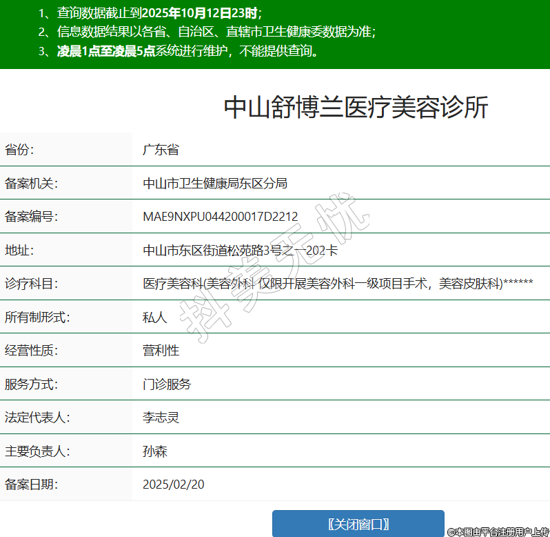 省份:廣東省備案機(jī)關(guān):中山市衛(wèi)生健康局東區(qū)分局備案編號(hào):MAE9NXPU044200017D2212地址:中山市東區(qū)街道松苑路3號(hào)之一202卡診療科目:醫(yī)療美容科(美容外科 僅限開(kāi)展美容外科一級(jí)項(xiàng)目手術(shù),美容皮膚科)******所有制形式:私人經(jīng)營(yíng)性質(zhì):營(yíng)利性服務(wù)方式:門診服務(wù)法定代表人:李志靈主要負(fù)責(zé)人:孫森備案日期:2025/02/20 -