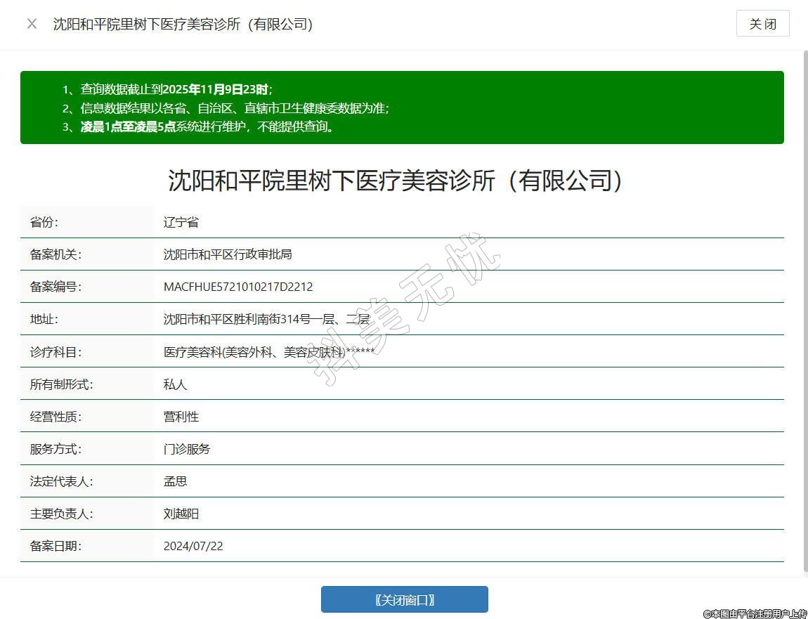 沈陽院里樹下醫(yī)療美容診所成立于2023年,位于沈陽市和平區(qū)勝利南街314號一層、二層,是經(jīng)沈陽市和平區(qū)市場監(jiān)督管理局登記批準的正規(guī)醫(yī)美機構,依法開展醫(yī)療美容服務及診所服務,診療范圍涵蓋隆鼻、祛眼袋、雙眼皮整形等整形項目,以及各類皮膚美容服務,團隊由具備相應執(zhí)業(yè)資質(zhì)的專業(yè)人員組成,以規(guī)范服務為核心,為有醫(yī)美需求的顧客提供合規(guī)、安心的診療體驗。