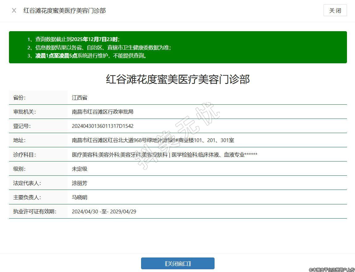 南昌花度蜜美醫(yī)療美容門診部成立于2023年,位于江西省南昌市紅谷灘區(qū)紅谷北大道968號綠地外灘城9#商業(yè)樓101、201、301室,持有合法經(jīng)營資質(zhì),堅守依法執(zhí)業(yè)、誠信服務(wù)原則,嚴格遵循《醫(yī)療美容服務(wù)管理辦法》等法規(guī),規(guī)范開展醫(yī)療美容、生活美容等許可項目,涵蓋私密抗衰、隆鼻、祛眼袋、唇部整形等服務(wù),配備具備專業(yè)資質(zhì)與豐富經(jīng)驗的醫(yī)護團隊,為求美者提供合規(guī)、規(guī)范的醫(yī)美服務(wù),致力于滿足多元美麗與健康需求。