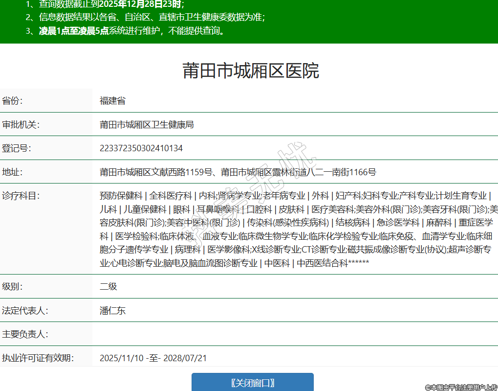 省份:福建省審批機(jī)關(guān):莆田市城廂區(qū)衛(wèi)生健康局登記號(hào):223372350302410134地址:莆田市城廂區(qū)文獻(xiàn)西路1159號(hào)、莆田市城廂區(qū)霞林街道八二一南街1166號(hào)診療科目:預(yù)防保健科 | 全科醫(yī)療科 | 內(nèi)科;腎病學(xué)專業(yè);老年病專業(yè) | 外科 | 婦產(chǎn)科;婦科專業(yè);產(chǎn)科專業(yè);計(jì)劃生育專業(yè) | 兒科 | 兒童保健科 | 眼科 | 耳鼻咽喉科 | 口腔科 | 皮膚科 | 醫(yī)療美容科;美容外科(限門診);美容牙科(限門診);美容皮膚科(限門診);美容中醫(yī)科(限門診) | 傳染科(感染性疾病科) | 結(jié)核病科 | 急診醫(yī)學(xué)科 | 麻醉科 | 重癥醫(yī)學(xué)科 | 醫(yī)學(xué)檢驗(yàn)科;臨床體液、血液專業(yè);臨床微生物學(xué)專業(yè);臨床化學(xué)檢驗(yàn)專業(yè);臨床免疫、血清學(xué)專業(yè);臨床細(xì)胞分子遺傳學(xué)專業(yè) | 病理科 | 醫(yī)學(xué)影像科;X線診斷專業(yè);CT診斷專業(yè);磁共振成像診斷專業(yè)(協(xié)議);超聲診斷專業(yè);心電診斷專業(yè);腦電及腦血流圖診斷專業(yè) | 中醫(yī)科 | 中西醫(yī)結(jié)合科******級(jí)別:二級(jí)法定代表人:潘仁東主要負(fù)責(zé)人:執(zhí)業(yè)許可證有效期:2025/11/10 -至- 2028/07/21 -