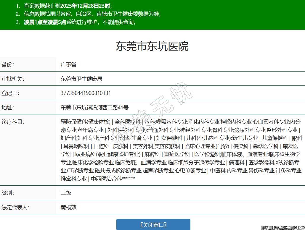 省份:廣東省審批機關:東莞市衛(wèi)生健康局登記號:377350441900810131地址:東莞市東坑鎮(zhèn)沿河西二路41號診療科目:預防保健科(健康體檢) | 全科醫(yī)療科 | 內科;呼吸內科專業(yè);消化內科專業(yè);神經(jīng)內科專業(yè);心血管內科專業(yè);內分泌專業(yè);老年病專業(yè) | 外科(手外科專業(yè));普通外科專業(yè);神經(jīng)外科專業(yè);骨科專業(yè);泌尿外科專業(yè);整形外科專業(yè) | 婦產科;婦科專業(yè);產科專業(yè);計劃生育專業(yè) | 婦女保健科 | 兒科(小兒內科專業(yè));新生兒專業(yè) | 兒童保健科 | 眼科 | 耳鼻咽喉科 | 口腔科 | 皮膚科 | 美容外科;美容皮膚科 | 臨床心理專業(yè)(門診) | 傳染科 | 急診醫(yī)學科 | 康復醫(yī)學科 | 職業(yè)病科(職業(yè)健康監(jiān)護專業(yè)) | 麻醉科 | 重癥醫(yī)學科 | 醫(yī)學檢驗科;臨床體液、血液專業(yè);臨床微生物學專業(yè);臨床化學檢驗專業(yè);臨床免疫、血清學專業(yè);臨床細胞分子遺傳學專業(yè) | 病理科 | 醫(yī)學影像科;X線診斷專業(yè);CT診斷專業(yè);磁共振成像診斷專業(yè);超聲診斷專業(yè);心電診斷專業(yè) | 中醫(yī)科;內科專業(yè);骨傷科專業(yè);針灸科專業(yè);推拿科專業(yè) | 中西醫(yī)結合科******級別:二級法定代表人:黃楊效主要負責人:黃楊效執(zhí)業(yè)許可證有效期:2025/02/07 -至- 2029/02/20 -