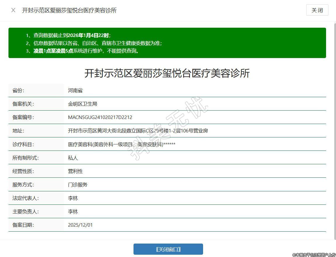 開封愛麗莎璽悅臺醫(yī)療美容診所成立于2023年,位于河南省開封市示范區(qū)黃河大街北段鼎立國際C區(qū)29號樓1-2層106號營業(yè)房,是經衛(wèi)生部門審核批準、持有《醫(yī)療機構執(zhí)業(yè)許可證》的正規(guī)醫(yī)療美容機構,業(yè)務范圍涵蓋醫(yī)療美容服務、生活美容服務等許可項目,提供眼部整形、鼻部整形、面部抗衰、皮膚護理等多樣化診療服務,全程落實術前知情告知與術后跟蹤護理制度水滴信用。
