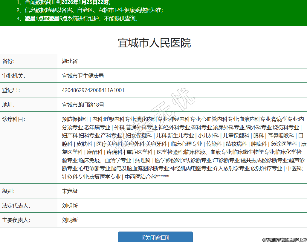 省份:湖北省審批機關(guān):宜城市衛(wèi)生健康局登記號:42048629742068411A1001地址:宜城市龍門路18號診療科目:預(yù)防保健科 | 內(nèi)科;呼吸內(nèi)科專業(yè);消化內(nèi)科專業(yè);神經(jīng)內(nèi)科專業(yè);心血管內(nèi)科專業(yè);血液內(nèi)科專業(yè);腎病學(xué)專業(yè);內(nèi)分泌專業(yè);老年病專業(yè) | 外科;普通外科專業(yè);神經(jīng)外科專業(yè);骨科專業(yè);泌尿外科專業(yè);胸外科專業(yè);燒傷科專業(yè) | 婦產(chǎn)科;婦科專業(yè);產(chǎn)科專業(yè) | 婦女保健科 | 兒科;新生兒專業(yè) | 小兒外科 | 兒童保健科 | 眼科 | 耳鼻咽喉科 | 口腔科 | 皮膚科 | 醫(yī)療美容科;美容外科;美容牙科 | 臨床心理專業(yè) | 傳染科 | 結(jié)核病科 | 腫瘤科 | 急診醫(yī)學(xué)科 | 康復(fù)醫(yī)學(xué)科 | 麻醉科 | 疼痛科 | 重癥醫(yī)學(xué)科 | 醫(yī)學(xué)檢驗科;臨床體液、血液專業(yè);臨床微生物學(xué)專業(yè);臨床化學(xué)檢驗專業(yè);臨床免疫、血清學(xué)專業(yè) | 病理科 | 醫(yī)學(xué)影像科;X線診斷專業(yè);CT診斷專業(yè);磁共振成像診斷專業(yè);超聲診斷專業(yè);心電診斷專業(yè);腦電及腦血流圖診斷專業(yè);神經(jīng)肌肉電圖專業(yè);介入放射學(xué)專業(yè);放射治療專業(yè) | 中醫(yī)科;針灸科專業(yè);康復(fù)醫(yī)學(xué)專業(yè) | 中西醫(yī)結(jié)合科******級別:未定級法定代表人:劉明新主要負責(zé)人:劉明新執(zhí)業(yè)許可證有效期:2007/12/25 -至- 2022/12/24 -