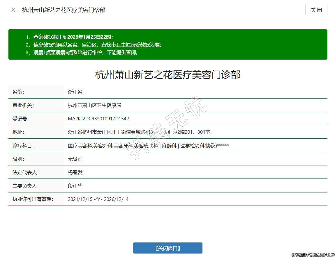 杭州新藝之花醫(yī)療美容門診部成立于2021年,位于浙江省杭州市蕭山區(qū)北干街道金城路413號,天匯園2幢201、301室,是取得正規(guī)醫(yī)療機構(gòu)執(zhí)業(yè)許可的醫(yī)美機構(gòu),獲批美容外科、美容牙科、美容皮膚科、麻醉科等診療科目,同時合規(guī)開展生活美容服務(wù),醫(yī)師團隊均擁有豐富臨床經(jīng)驗,秉持精細、微創(chuàng)的診療理念,致力于打造專業(yè)、安心的醫(yī)美體驗。