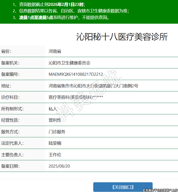 省份:河南省備案機(jī)關(guān):沁陽(yáng)市衛(wèi)生健康委員會(huì)備案編號(hào):MAEM9QX6141088217D2212地址:河南省焦作市沁陽(yáng)市太行街道凱旋門大門南側(cè)2號(hào)診療科目:醫(yī)療美容科(美容皮膚科)******所有制形式:私人經(jīng)營(yíng)性質(zhì):營(yíng)利性服務(wù)方式:門診服務(wù)法定代表人:陸亞楠主要負(fù)責(zé)人:王作倫備案日期:2025/08/20 -