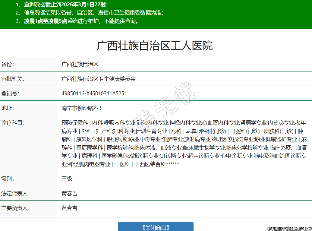 省份:廣西壯族自治區(qū)審批機關(guān):廣西壯族自治區(qū)衛(wèi)生健康委員會登記號:49850116-X45010311A5251地址:南寧市柳沙路2號診療科目:預(yù)防保健科 | 內(nèi)科;呼吸內(nèi)科專業(yè);消化內(nèi)科專業(yè);神經(jīng)內(nèi)科專業(yè);心血管內(nèi)科專業(yè);腎病學(xué)專業(yè);內(nèi)分泌專業(yè);老年病專業(yè) | 外科 | 婦產(chǎn)科;婦科專業(yè);計劃生育專業(yè) | 眼科 | 耳鼻咽喉科(門診) | 口腔科(門診) | 皮膚科(門診) | 腫瘤科 | 康復(fù)醫(yī)學(xué)科 | 職業(yè)病科;職業(yè)中毒專業(yè);塵肺專業(yè);放射病專業(yè);物理因素損傷專業(yè);職業(yè)健康監(jiān)護專業(yè) | 麻醉科 | 重癥醫(yī)學(xué)科 | 醫(yī)學(xué)檢驗科;臨床體液、血液專業(yè);臨床微生物學(xué)專業(yè);臨床化學(xué)檢驗專業(yè);臨床免疫、血清學(xué)專業(yè) | 病理科 | 醫(yī)學(xué)影像科;X線診斷專業(yè);CT診斷專業(yè);超聲診斷專業(yè);心電診斷專業(yè);腦電及腦血流圖診斷專業(yè);神經(jīng)肌肉電圖專業(yè) | 中醫(yī)科 | 中西醫(yī)結(jié)合科******級別:三級法定代表人:黃春吉主要負責(zé)人:黃春吉執(zhí)業(yè)許可證有效期:2016/08/11 -至- 2031/08/10 -