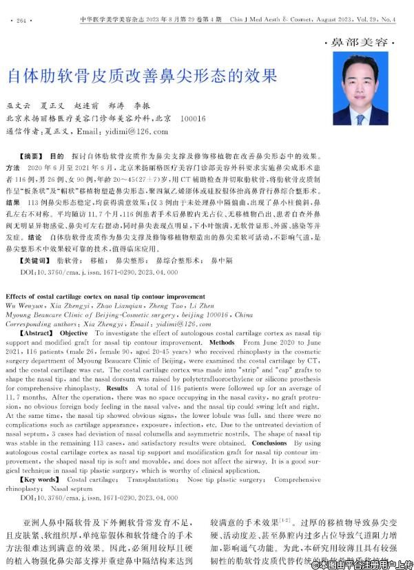 ?。▍⒄铡吨腥A醫(yī)學(xué)美學(xué)雜志》2023年8月第29卷第4期《自體肋軟骨皮質(zhì)改善鼻尖形態(tài)的效果》)