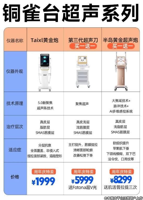 除了超聲炮,銅雀臺超聲系列抗衰價格也是很香的哦。Taixl黃金炮1999元,第三代超聲刀/黃金超聲炮買一送一。