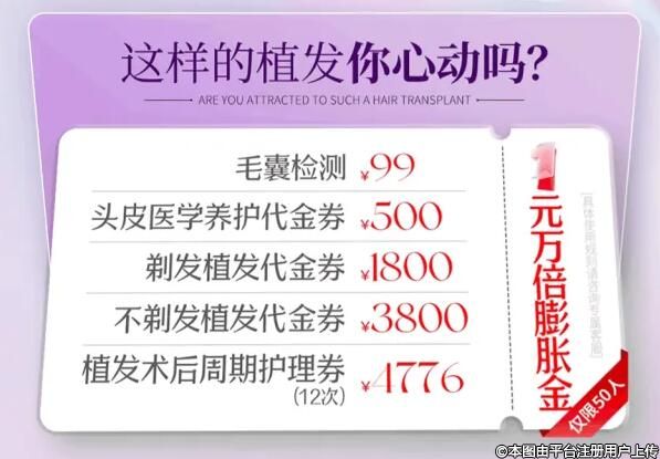 • 哇,搶了這個膨脹金植發(fā)好劃算啊,上次我去植發(fā)花了幾萬塊錢,就是因為沒有活動才那么貴的,后面過幾天知道有活動才后悔不已,早知道就不植發(fā)那么早了,花了那么多錢。