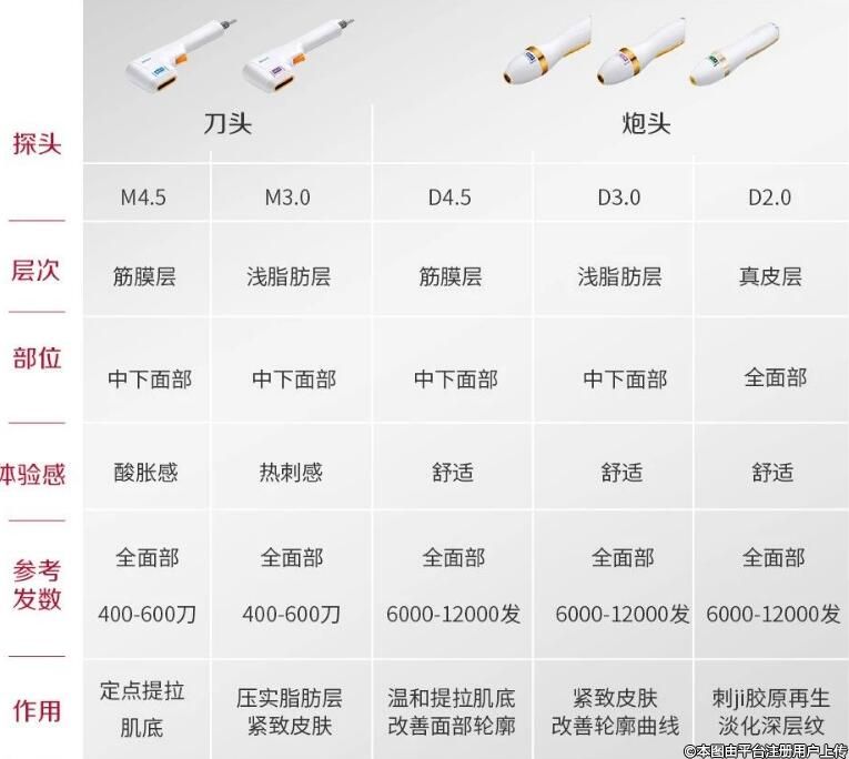刀頭M4.5+刀頭M3.0+炮頭D4.5+炮頭D3.0(俗稱:2刀2炮)適合:中重度面部松弛下垂、皺紋嚴重、肉肉臉、下頜脂肪堆積、眼周松弛、口角囊?guī)А㈦p下巴、法令紋等
