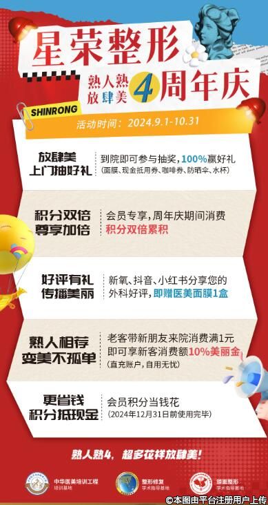 9月1日-10月31日,“熟人熟4放肆美”星榮整形外科醫(yī)院周年慶典盛大啟幕。星榮“熟人節(jié)”精心策劃了一系列豐富多彩、極具吸引力的福利活動(dòng),讓每一位踏入星榮的顧客都能感受到前所未有的尊貴體驗(yàn)。